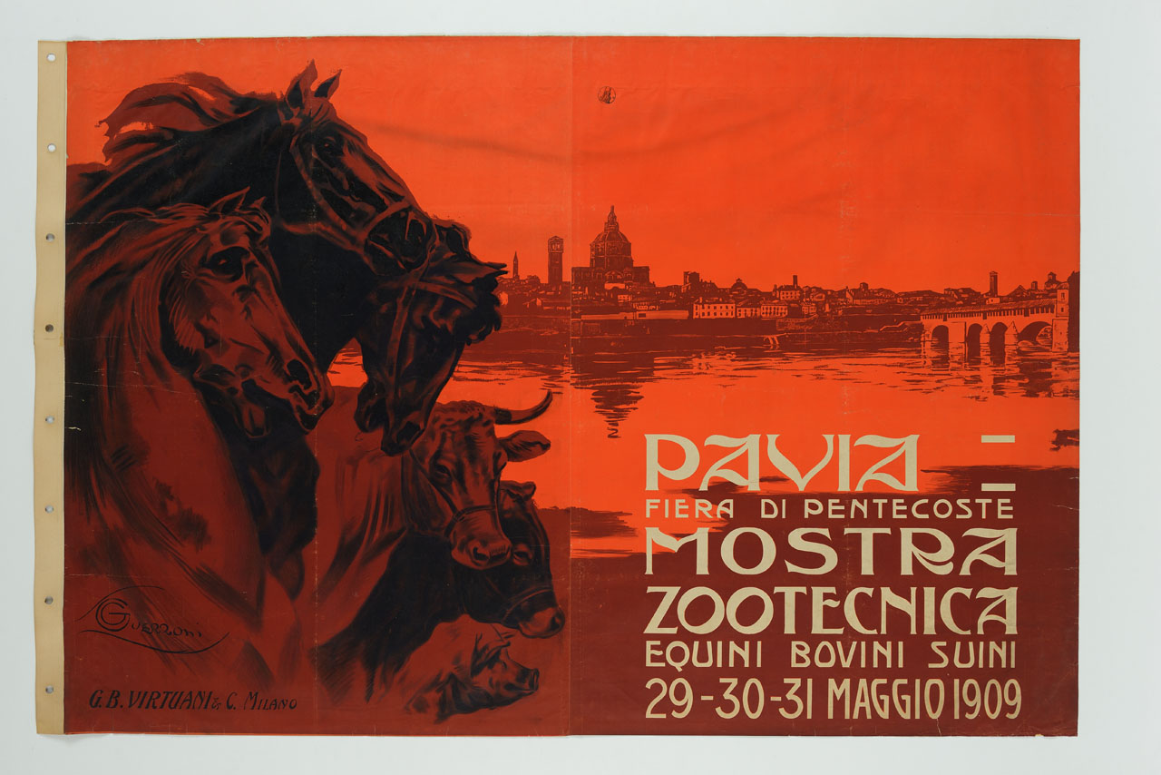 Lettura iconografica: veduta di città; chiesa; campanili; fiume; ponte; cavalli; toro; mucca; maiale. Categoria merceologica/ tipo evento: allevamento; fiere; mostre. Nomi: fiera di Pentecoste; mostra zootecnica; Ticino; ponte coperto; duomo di Pavia; chiesa di Santa Maria Assunta e Santo Stefano protomartire. Luoghi: Voghera; Pavia