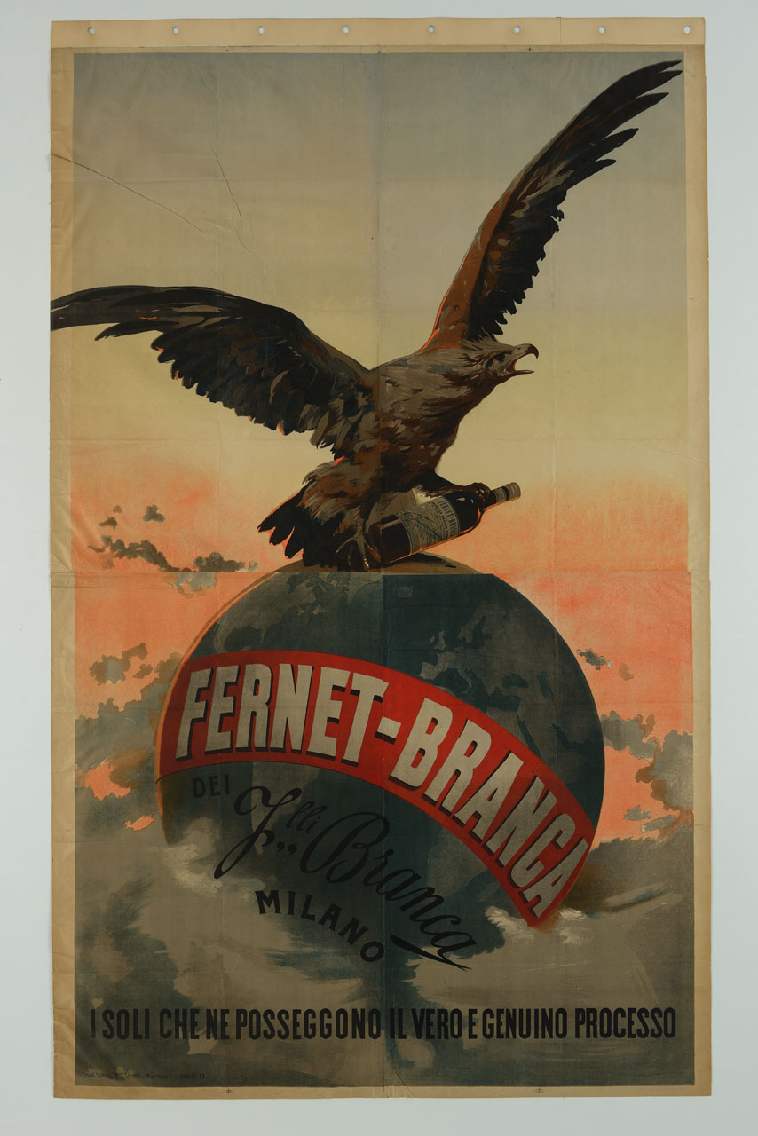 Lettura iconografica: aquila; bottiglia d’amaro; globo terrestre; tramonto; nuvole. Categoria merceologica/ tipo evento: industria alimentare; bevande; liquori; amaro. Nomi: Fernet Branca; Bernardino Branca; società Fratelli Branca; Giuseppe Branca; Luigi Branca; Stefano Branca; Dino Branca. Luoghi: Milano