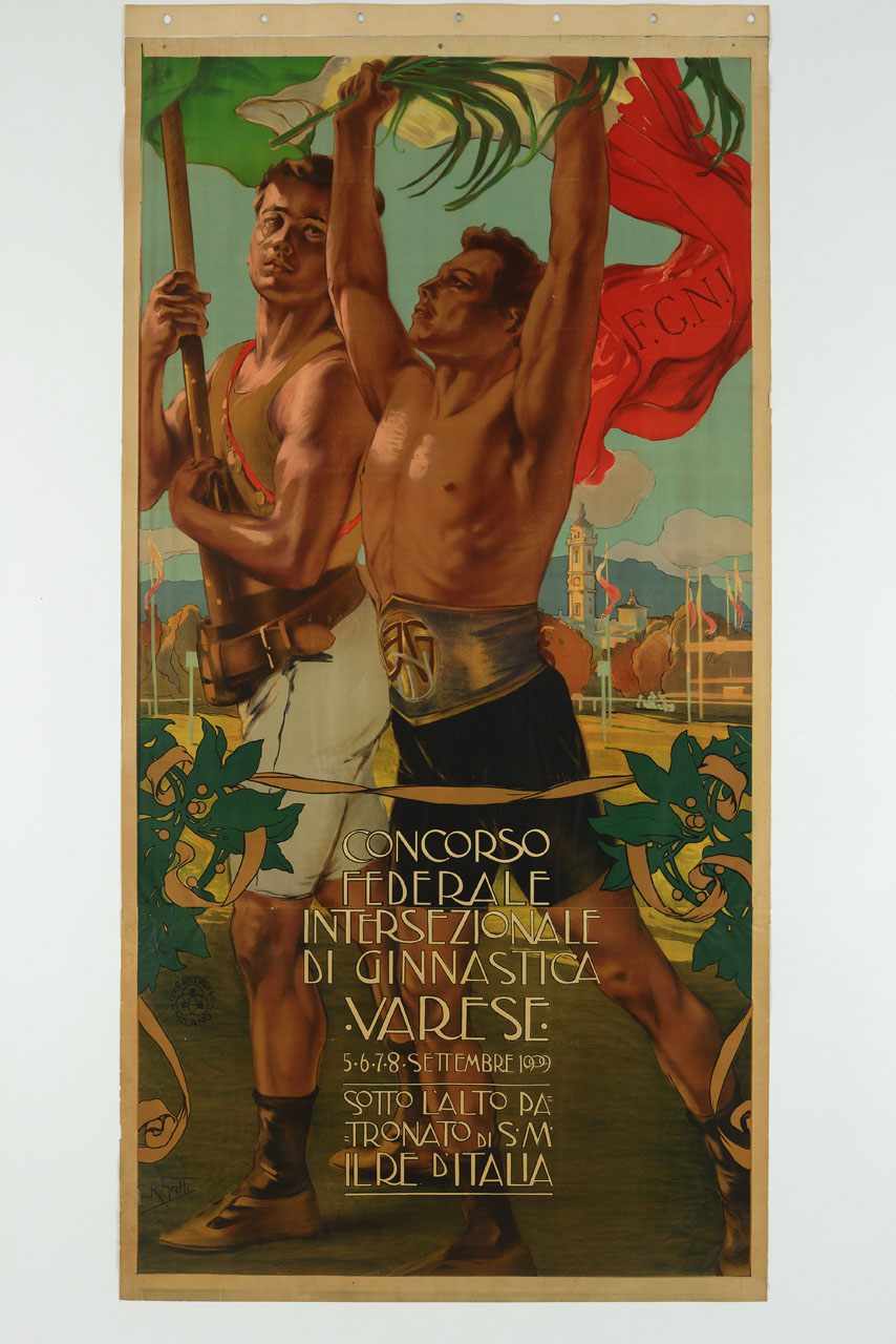 Lettura iconografica: figure maschili; bandiera italiana; tricolore italiano; foglia di palma; stadio; veduta di città; campanile; tiburio; chiesa. Categoria merceologica/ tipo evento: sport; concorsi; ginnastica; associazioni sportive. Nomi: Concorso federale internazionale di Varese; FGNI; Federazione Ginnastica Nazionale Italiana; Basilica Collegiata di San Vittore; Vittorio Emanuele III. Luoghi: Varese