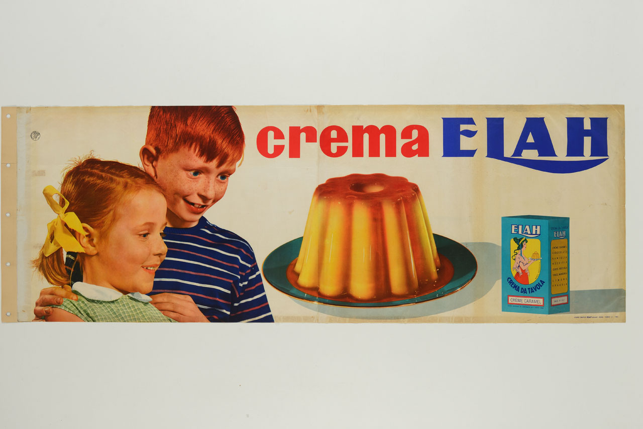 Lettura iconografica: bambino; bambina; crème caramel; piatto; confezione alimentare; preparato per budino. Categoria merceologica/ tipo evento: industria alimentare; dolciumi; crema da tavola. Nomi: Elah; Elah Crema da tavola. Luoghi: Italia; Genova