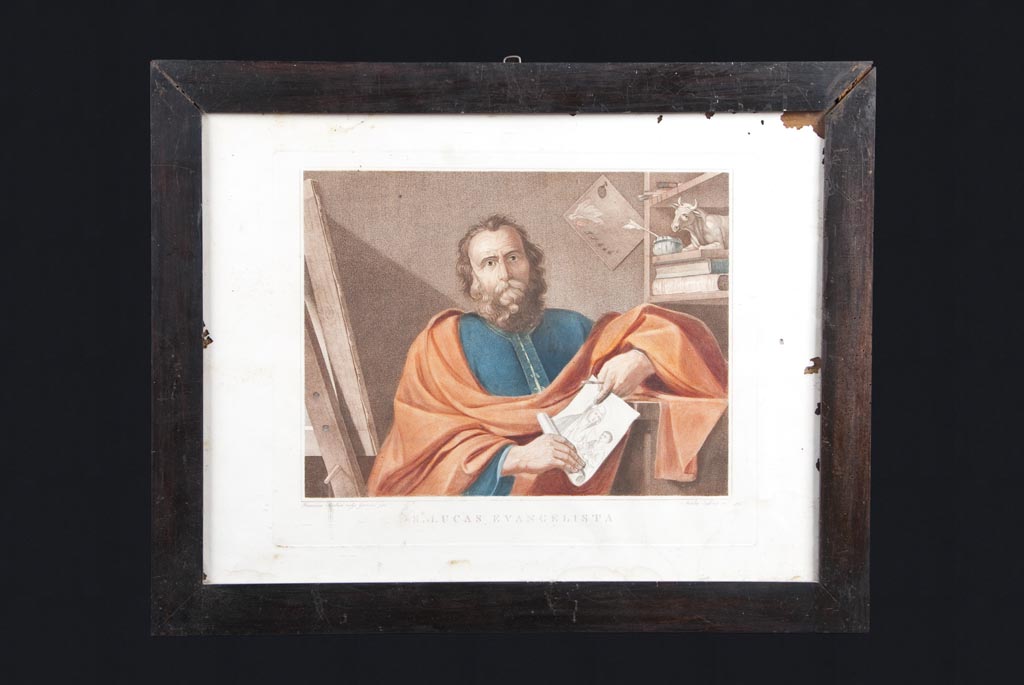 - NOTIZIE STORICO CRITICHE La serie di stampe è derivata da un ciclo composto da quattro dipinti, raffiguranti gli Evangelisti con i rispettivi attributi identificativi. La serie, iniziata nel 1621, fu realizzata dal Guercino per Domenico Fabbri e tradotta in incisione per la prima volta da Pietro Fontana. Fino al 1812 presso la collezione Barberini, fu smembrata a seguito della divisione con il ramo della famiglia Sciarra (presso il quale confluirono i quadri con le raffigurazioni di Marco e Giovanni evangelisti)