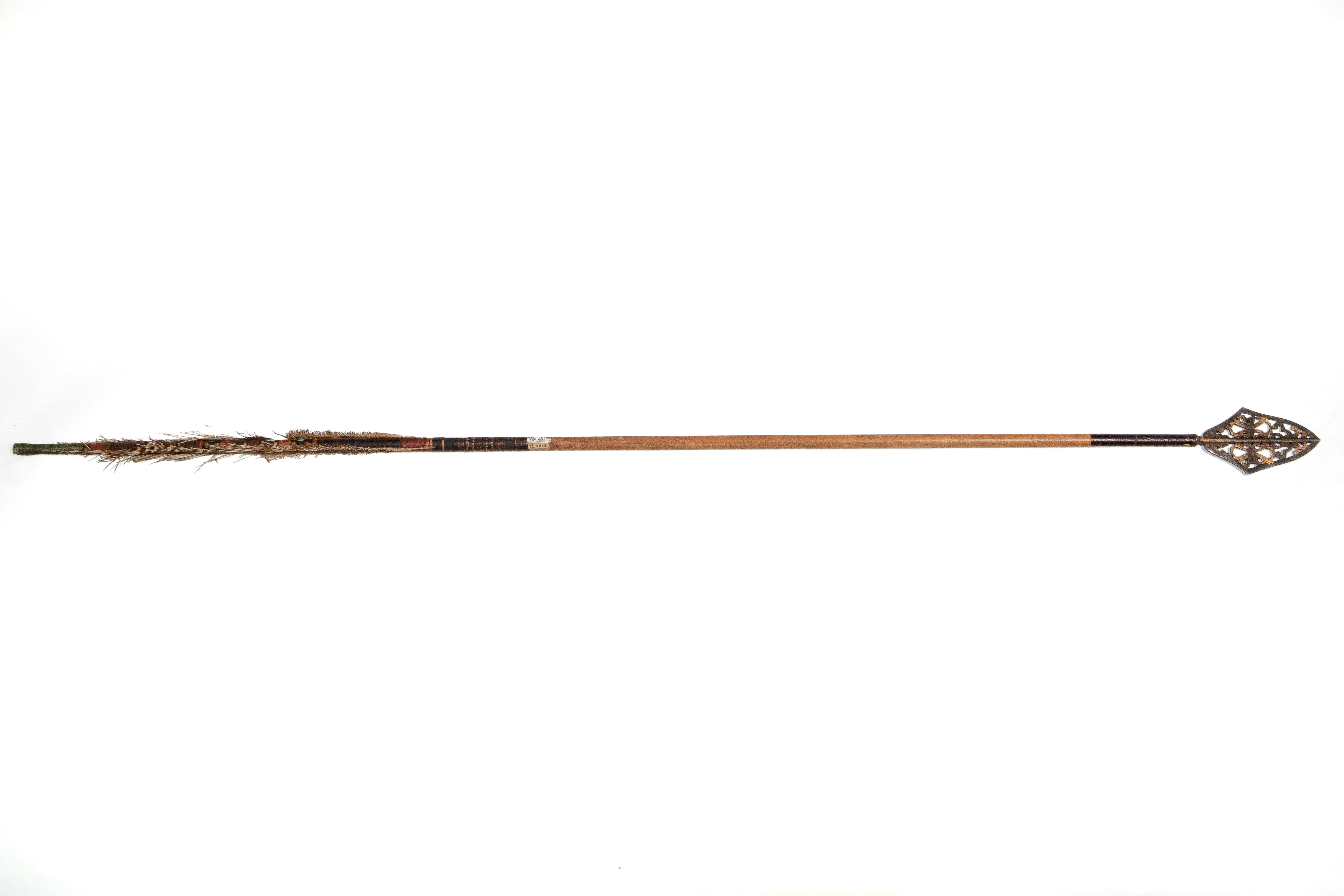 Freccia mancese con punta larga in ferro dorato forata in modo da creare decorazione ad arabeschi, con larghe piume, la cocca rivestita in pelle di razza fissata da strisce di corteccia di ciliegio laccata