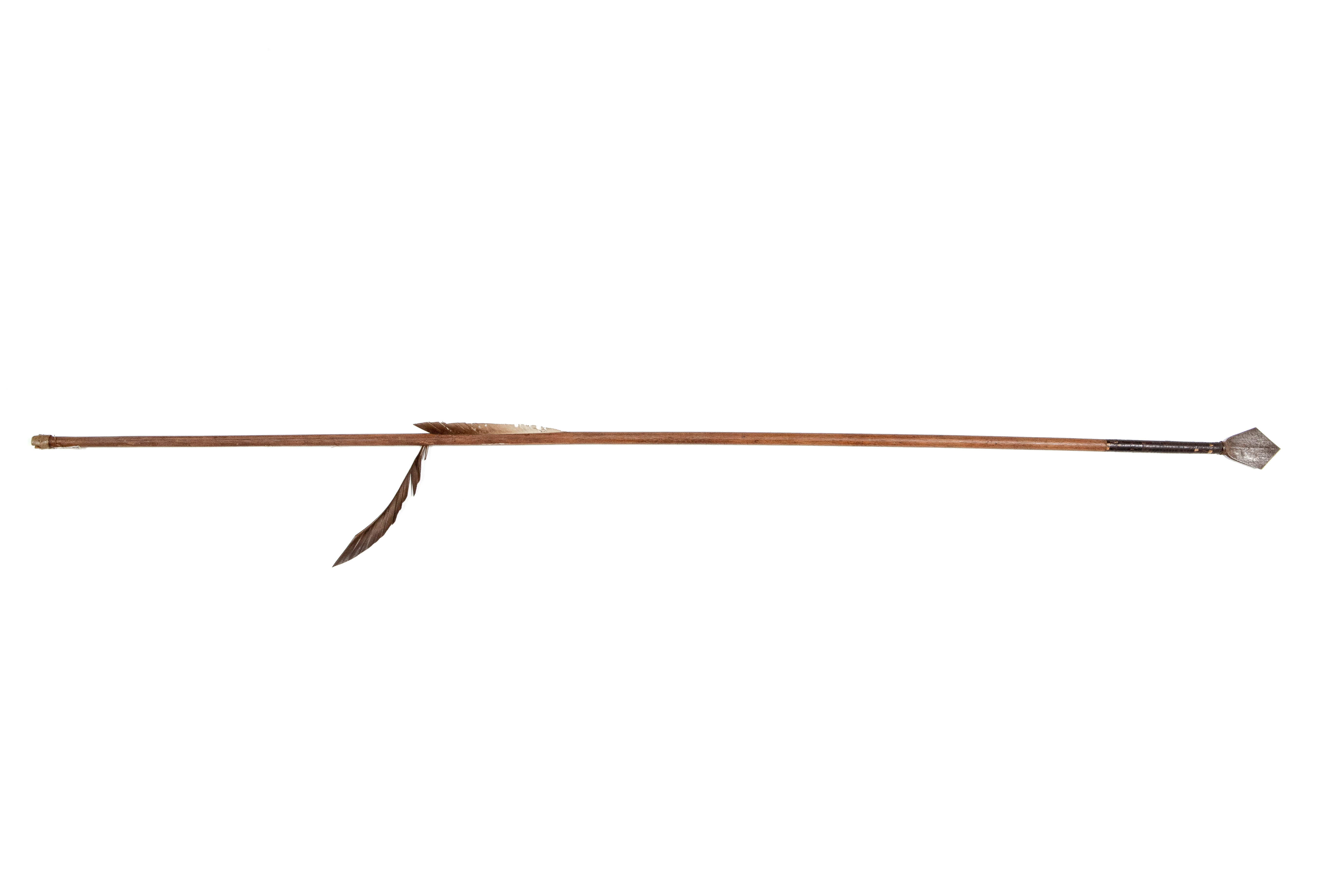 Freccia mancese da caccia, con punta larga in ferro, con larghe piume, la cocca rivestita in pelle di razza e rivestimento di strisce di corteccia di ciliegio laccata subito sotto la cuspide