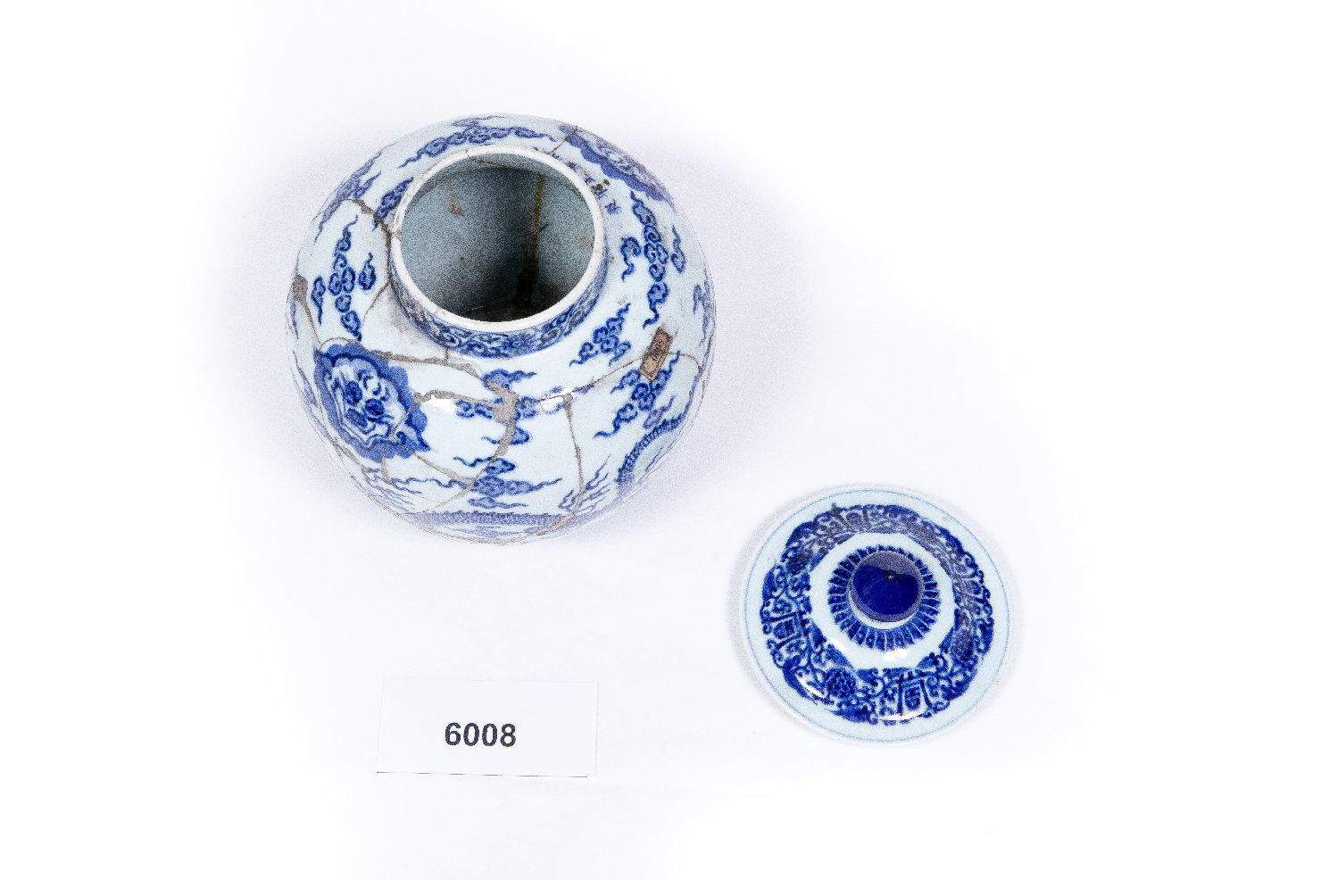Vaso di porcellana bianca e blu con coperchio decorato con motivi floreali e vegetali e dall'ideogramma 周. Il corpo del vaso è decorato da una raffigurazione di un drago a tre artigli e una testa di leone nel cielo, circondati da nuvole stilizzate