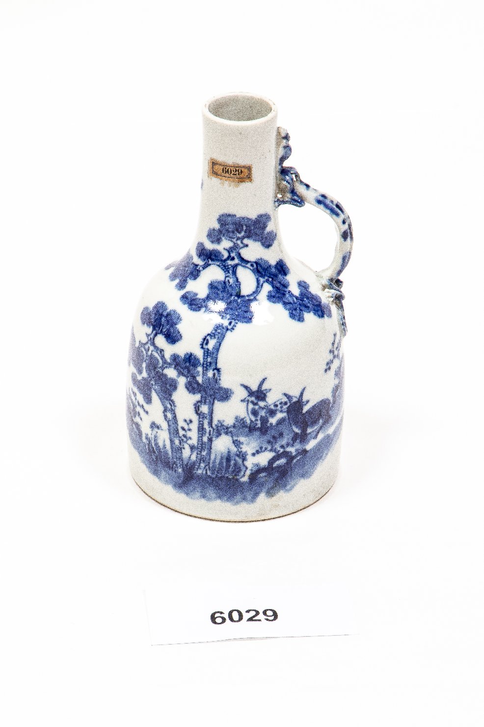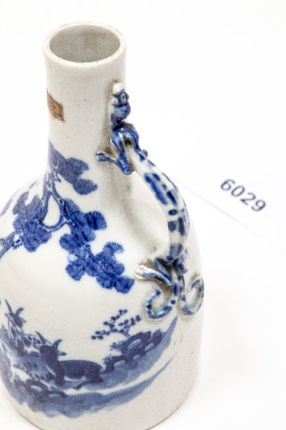 Vaso di porcellana bianca e blu a forma di brocca decorato con una scena d’esterno: un pascolo con delle capre che si godono l’ombra di un albero di pino. Il manico è a forma di geco
