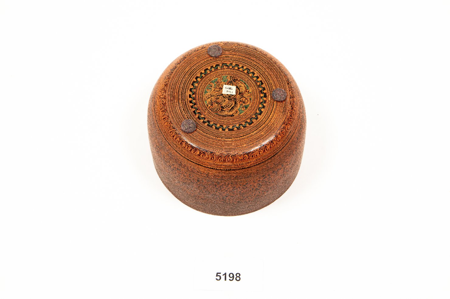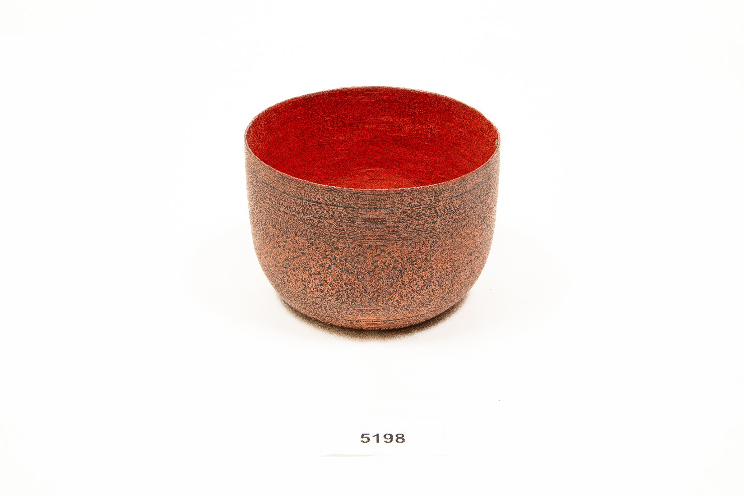 Coppa per l'acqua detta "khwet" fatta di bambú in lacca rossa, gialla, nera e verde con decorazioni geometriche e vegetali realizzate con la tecnica yun