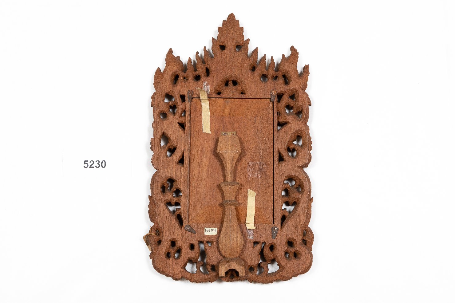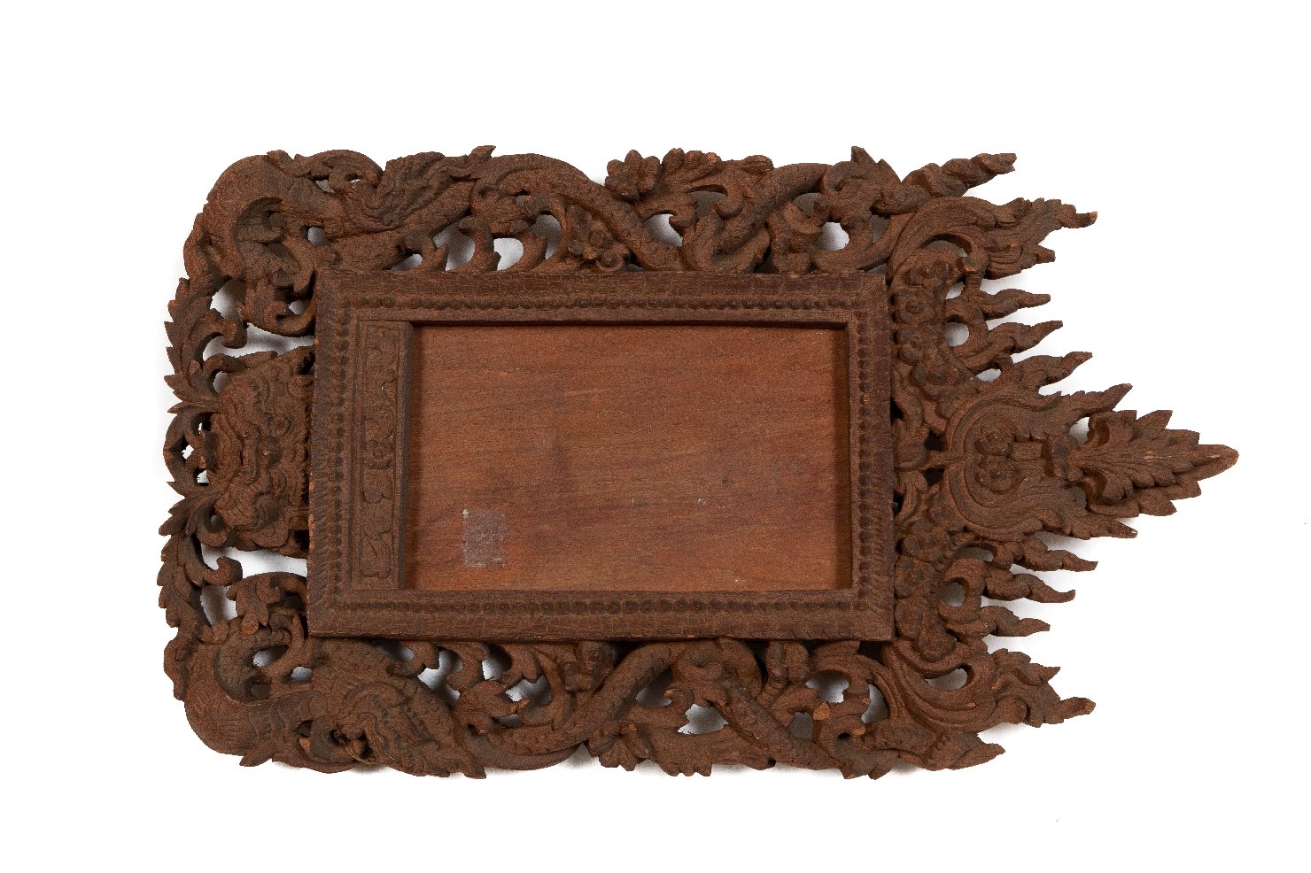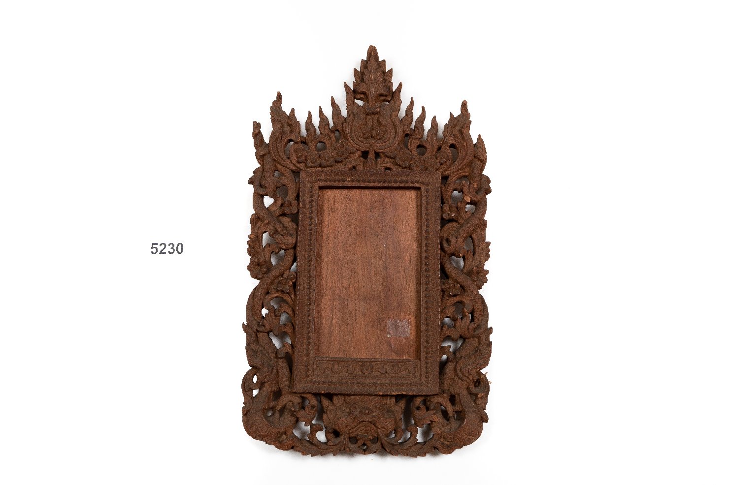 Cornice in legno intagliato a forma rettangolare con intarsi di motivi vegetali e di fiori e con una testa di drago nella parte inferiore
