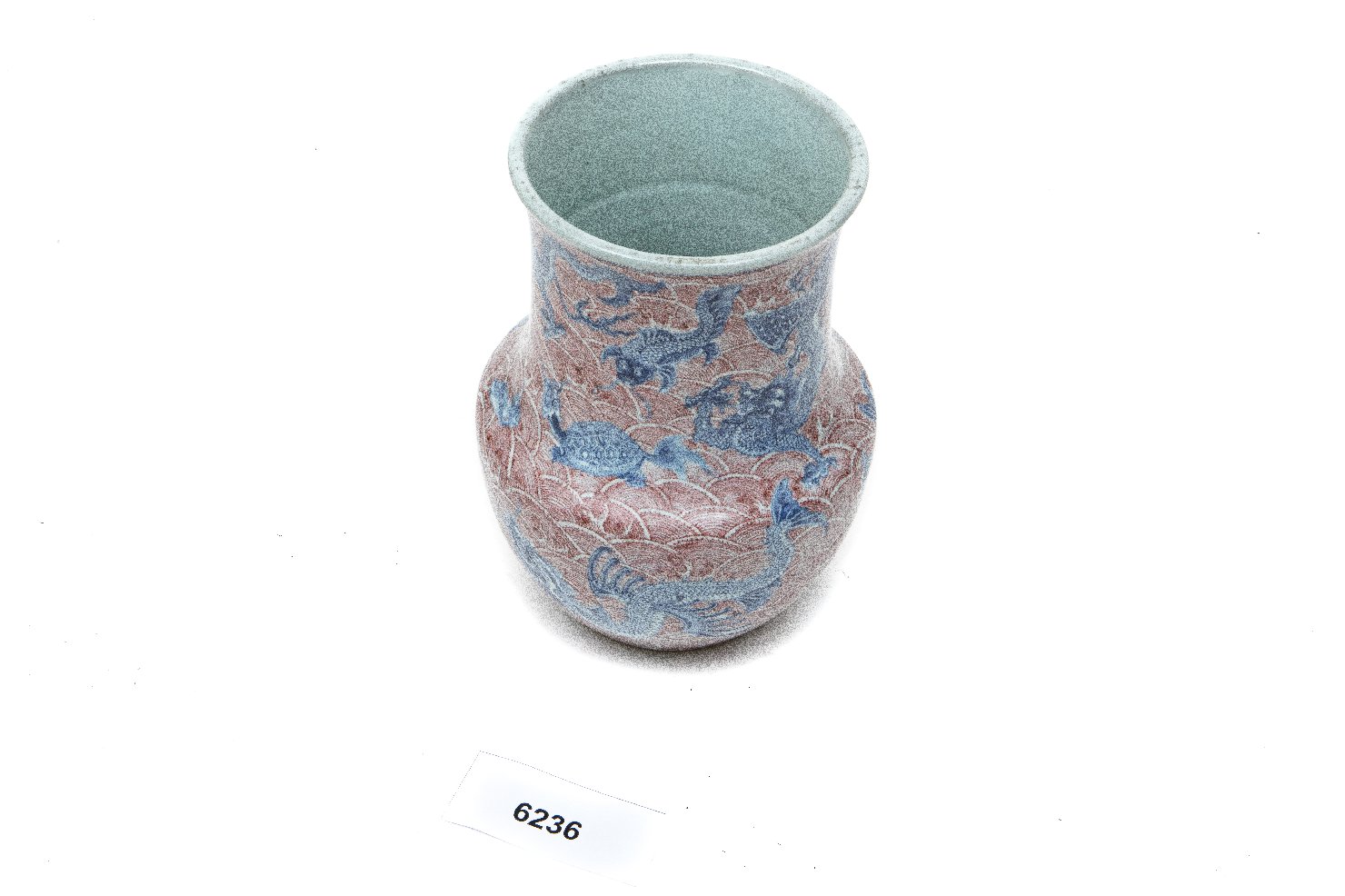 Vaso in porcellana policroma dalla bocca molto larga. E' decorato su tutta la superficie esterna da un motivo di onde continuate (seigaiha) in smalto rosso, su cui volano e nuotano animali fantastici in smalto blu (draghi, tartarughe dalla lunga coda, carpe alate)