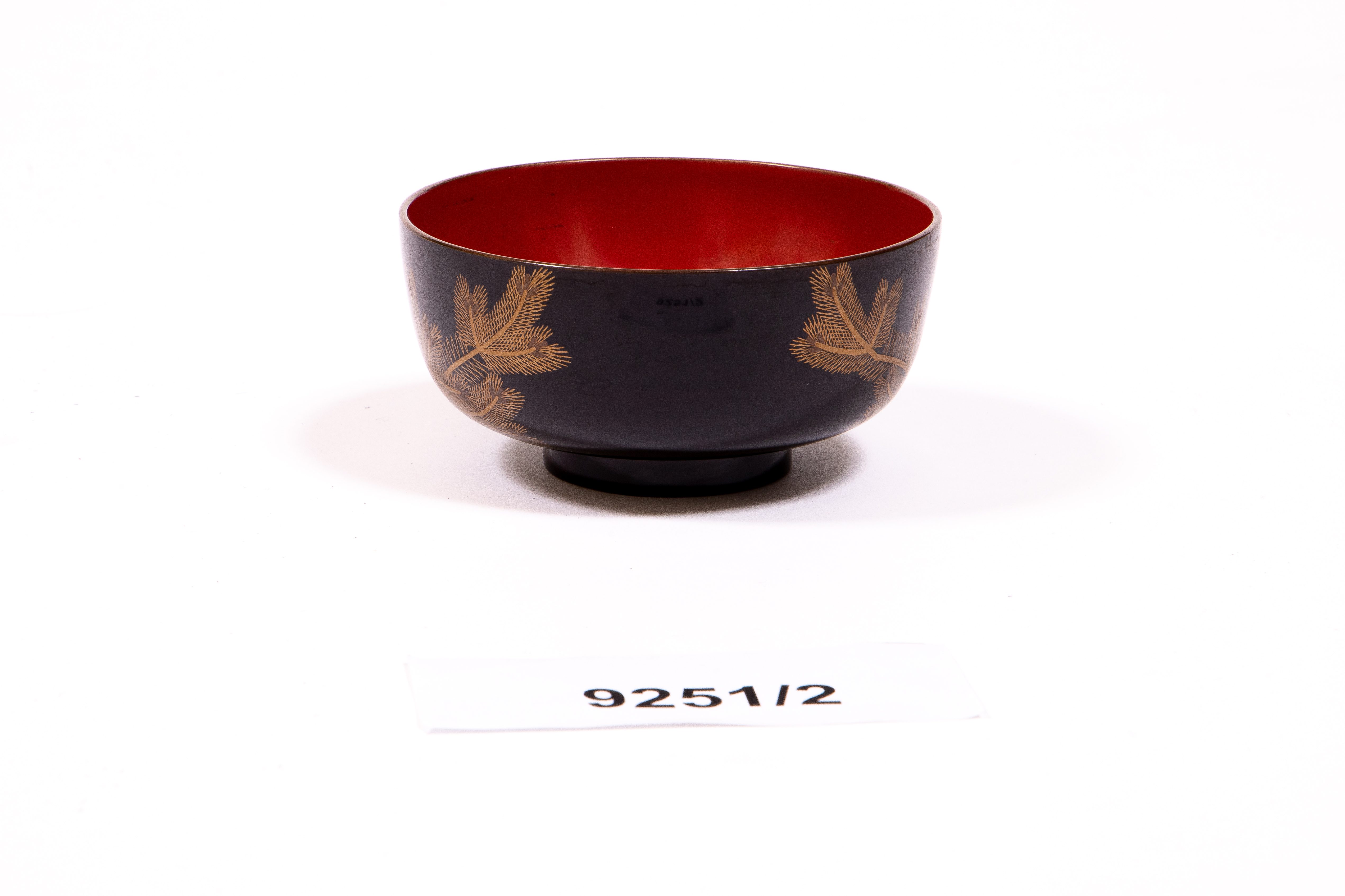 Ciotola di legno laccato all'esterno in nero con decorazioni dorate di pini, e all'interno in rosso