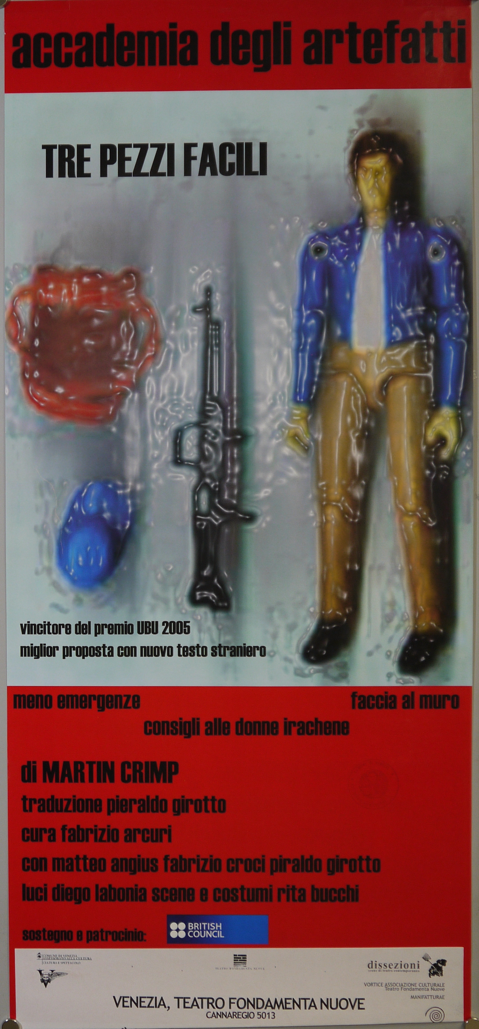 Lettura iconografica: Omino giocattolo in plastica con relativo equipaggimento di fucile, zaino, cappello. Categoria merceologica: evento culturale, spettacolo teatrale. Nomi: Accademia degli Artefatti; Martin Crimp; Pieraldo Girotto; Fabrizio Arcuri; Matteo Angius; Fabrizio Croci; Diego Labonia; Rita Bucchi; British Council; Comune di Venezia Assessorato alla Cultura, Teatro Fondamenta Nuove; Dissezioni; Vortice Associazione Culturale; Manifatturae. Luoghi: Teatro Fondamenta Nuove; Venezia