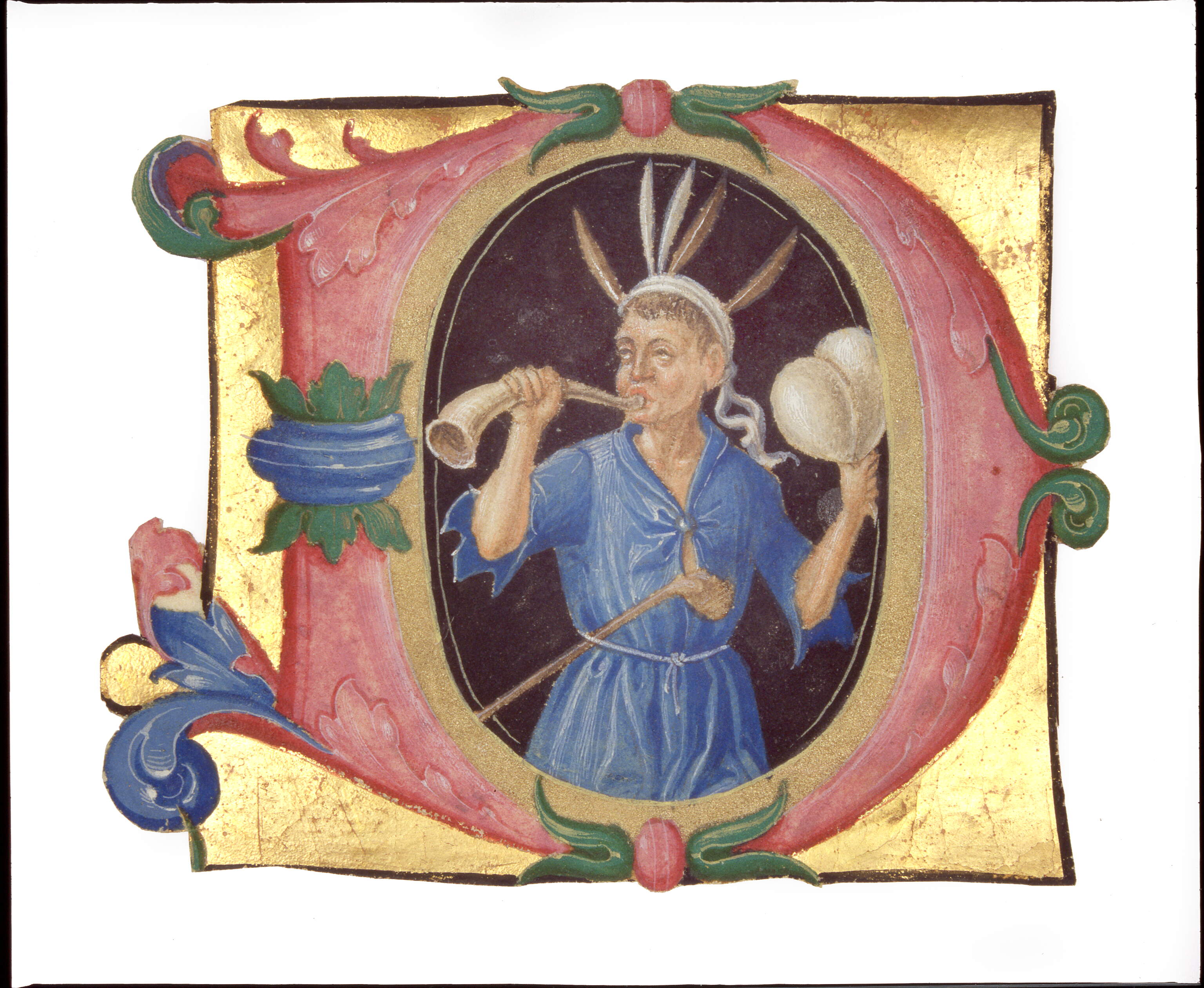 Iniziale "D[ixit insipiens]" di colore rosa chiaro, ornata con fregi azzurri e verdi, figurata con lo stolto entro campo esterno in lamina d’oro. Il vano centrale figurato di forma ovale è contornato da una fascia in porporina. Sul verso (ma recto) qualche sillaba in inchiostro bruno e rosso, con tetragramma tracciato in inchiostro rosso con notazione quadrata in inchiostro bruno