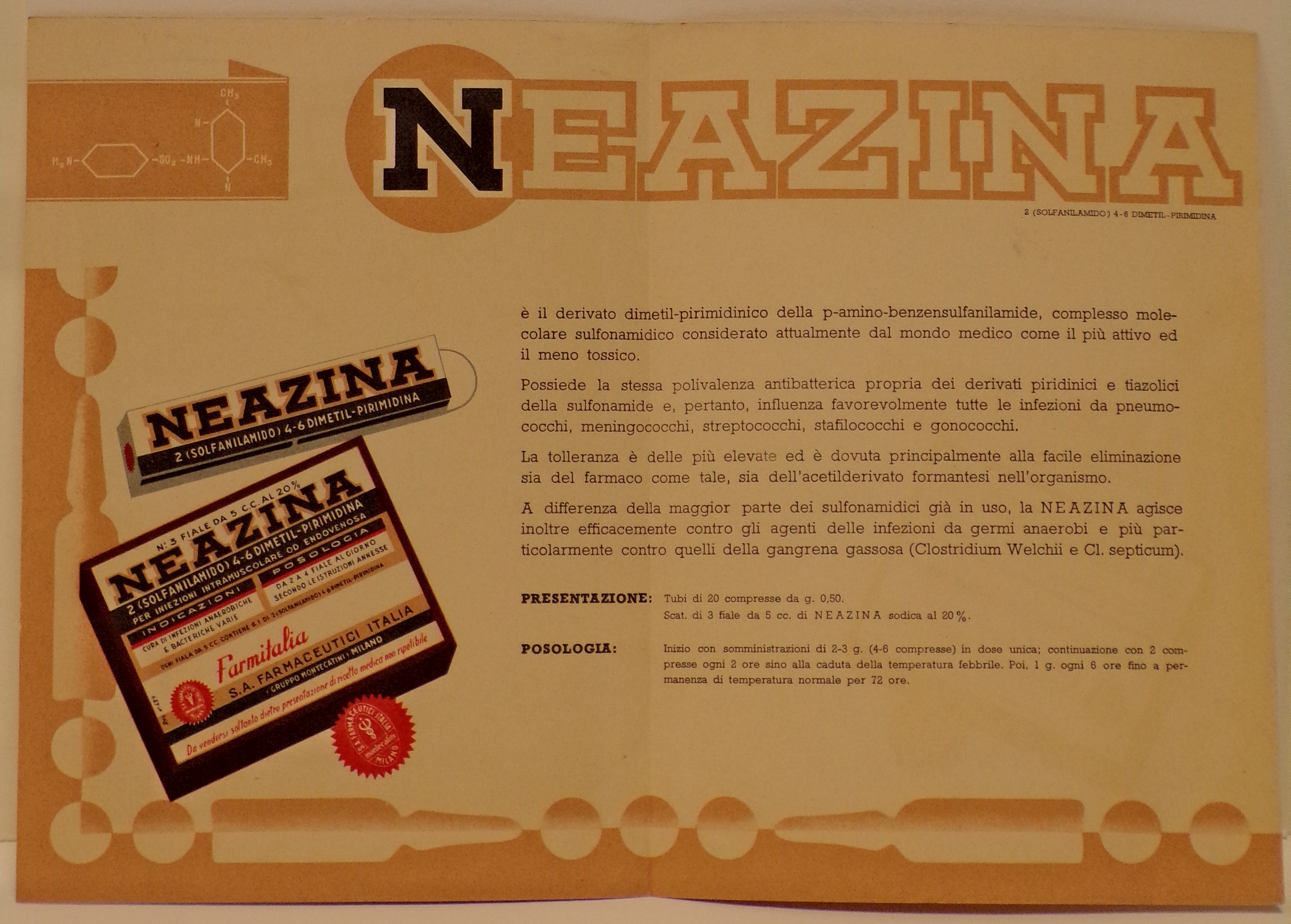 Lettura iconografica: cono; sfera; cubo; deserto; cielo assolato; nuvole; pietre; formule chimiche. Categoria merceologica/tipo evento: industria chimica; industria farmaceutica; produzione antibiotici e antibatterici.- Nomi: [Giuseppe] Casolaro; Neazina; Farmitalia; S.A. Farmaceutici Italia; Gruppo Montecatini; Farmacia Brunetti; E. Vigevani; Tipo-Litografia Turati Lombardi e C.; Direzione Poste e Telegrafi. Luoghi: Treviso; Milano