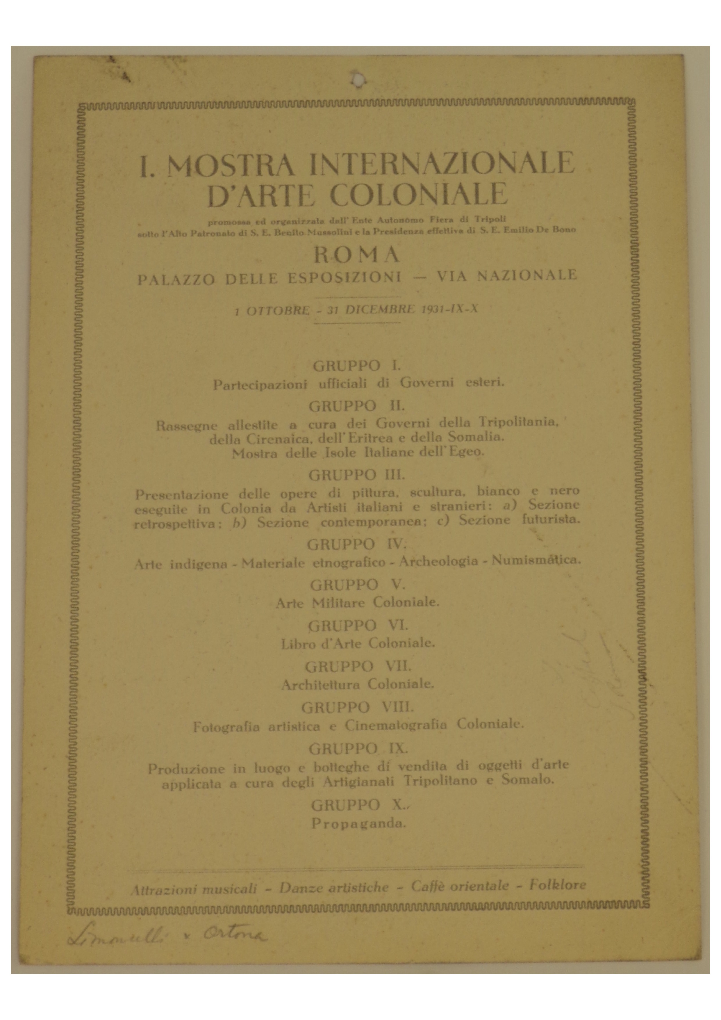 - ISCRIZIONI metà inferiore - PRIMA MOSTRA/ INTERNAZIONALE/ D'ARTE COLONIALE/ ROMA - PALAZZO DELLE ESPOSIZIONI/ VIA NAZIONALE - OTTOBRE - DICECCMBRE - 1931 - IX-X/ RIDUZIONI FERROVIARIE DA TUTE LE STAZIONI DEL REGNO - corsivo alto-basso -