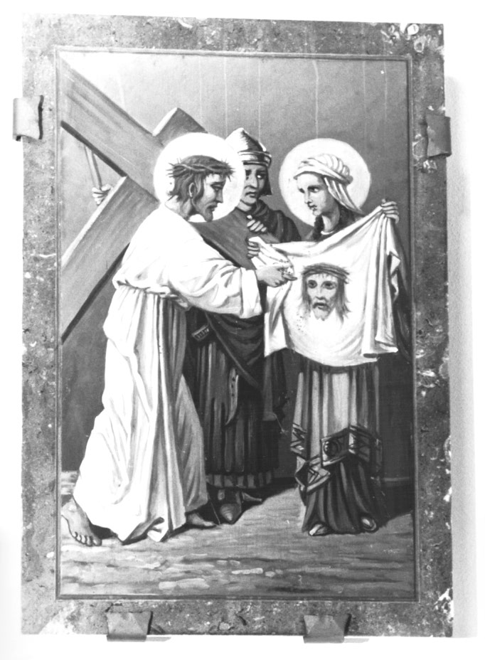 - NOTIZIE STORICO CRITICHE Le Via Crucis sono opera del pittore e restauratore Clemente Del Neri ed esprimono una produzione accademica tramite il contrasto violentemente str idente dei colori la deformazione delle figure e la gestualita' grottescam ente esasperata. Va rilevata la presenza della firma dell'autore appena l eggibile, nell'ultima stazione (XIV) in basso a sinistra