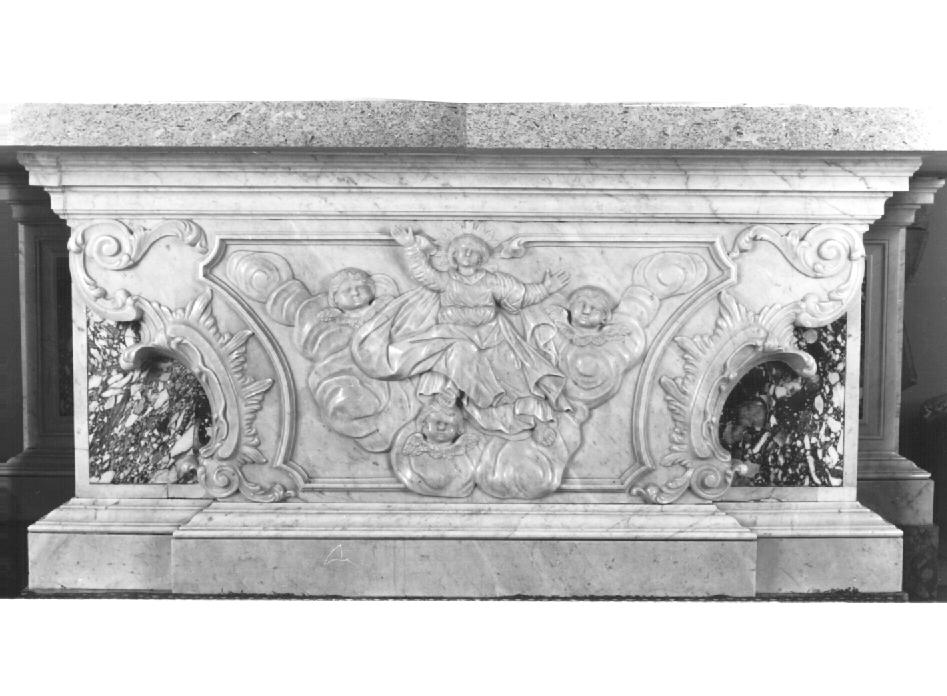 - NOTIZIE STORICO CRITICHE Questo elegante altare in marmi policromi venne collocato nell'abside nel 1775/ in seguito ai lavori di restauro del 1950 nella chiesa, oltre al rif acimento degli intonaci, la chiusura di nicchie e la rimozione di due alta ri laterali all'arco trionfale, si pose mano in parte anche all'altar magg iore, al quale vennero smantellate due graziose porte laterali sormontate rispettivamente da due statue