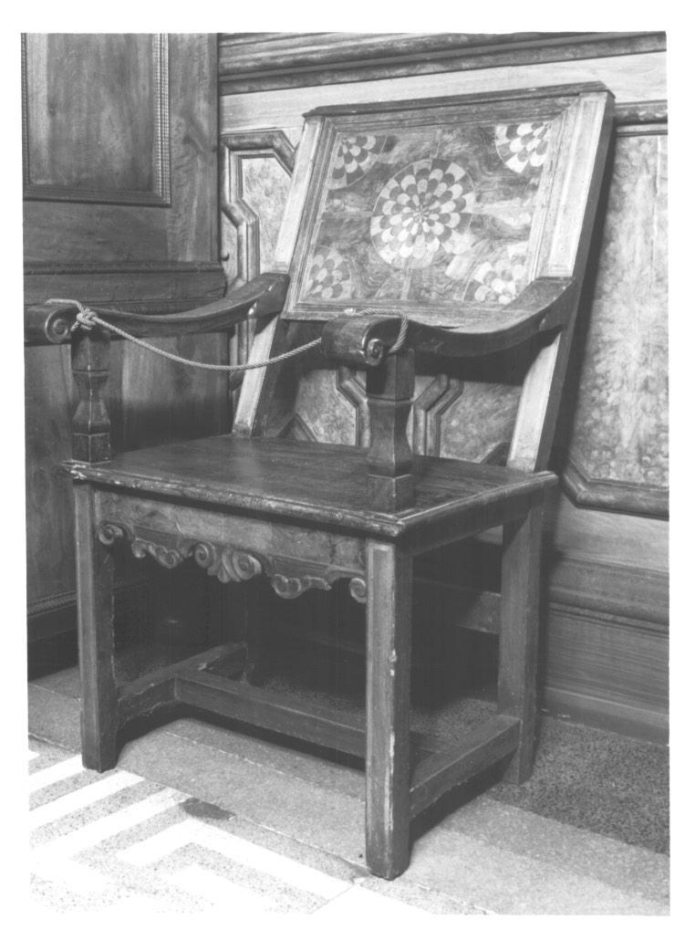 Le gambe diritte si presentano a sezione quadrangolare collegate da traverse, mentre il sedile liscio ha un bordo modanato. La fascia anteriore ha un profilo mosso a volute vegetali: i braccioli sono curvi e lo schienale con pannello è decorato a intarsio a motivi geometrici
