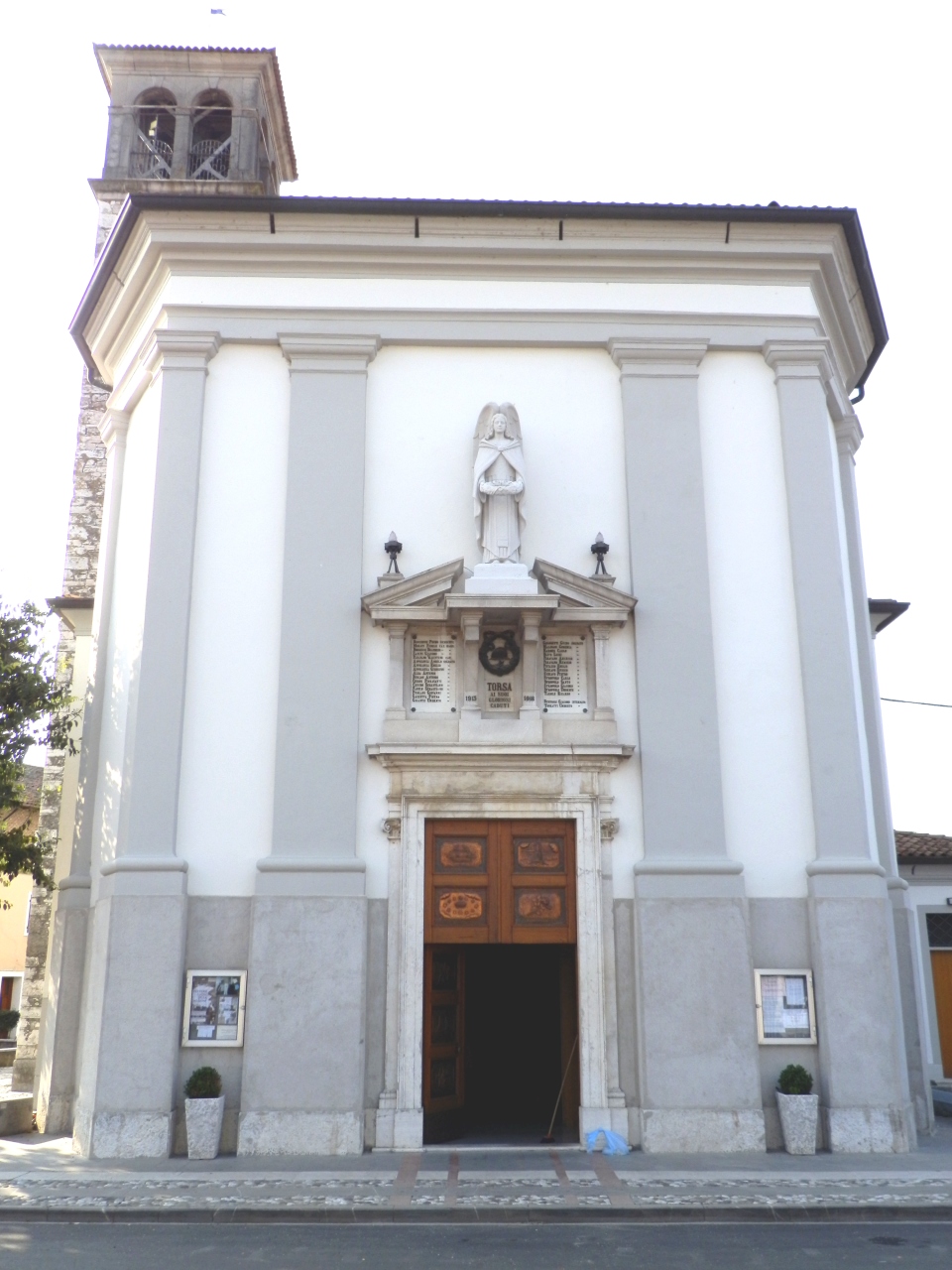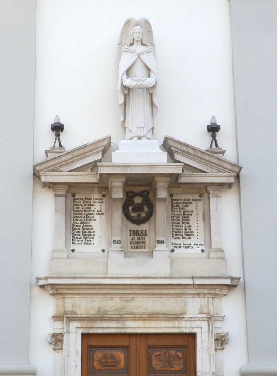 Il manufatto è stato realizzato sulla facciata principale della chiesa di Torsa, sopra ed integrato al portale d'ingresso. Consiste in una struttura a forma di tempietto, costituita da basamento, pilastrini, architrave, timpano spezzato, attraverso il quale, sostenuto da due mensole centrali, emerge la statua dell'angelo che si erge alta sopra la struttura. La parte architettonica è composta da cornici modanate e mensole in pietra d'Aurisina, completata da lesene e scansi intonacati. La figura superiore è in marmo bianco, realizzata a tuttotondo. Ai lati, sul timpano, due basi sostengono dei tripodi in ferro battuto con relative luci, a fiamma. Le iscrizioni, in caratteri applicati di bronzo, sono inserite nei riquadri del "tempietto". Nella nicchia centrale si trova, sotto un bassorilievo bronzeo raffigurante un elmetto con corona d'alloro, l'epigrafe dedicatoria, sui montanti delle mensole gli anni del conflitto, mentre nelle nicchie laterali rispettivamente le due lapidi in travertino con i nomi dei caduti