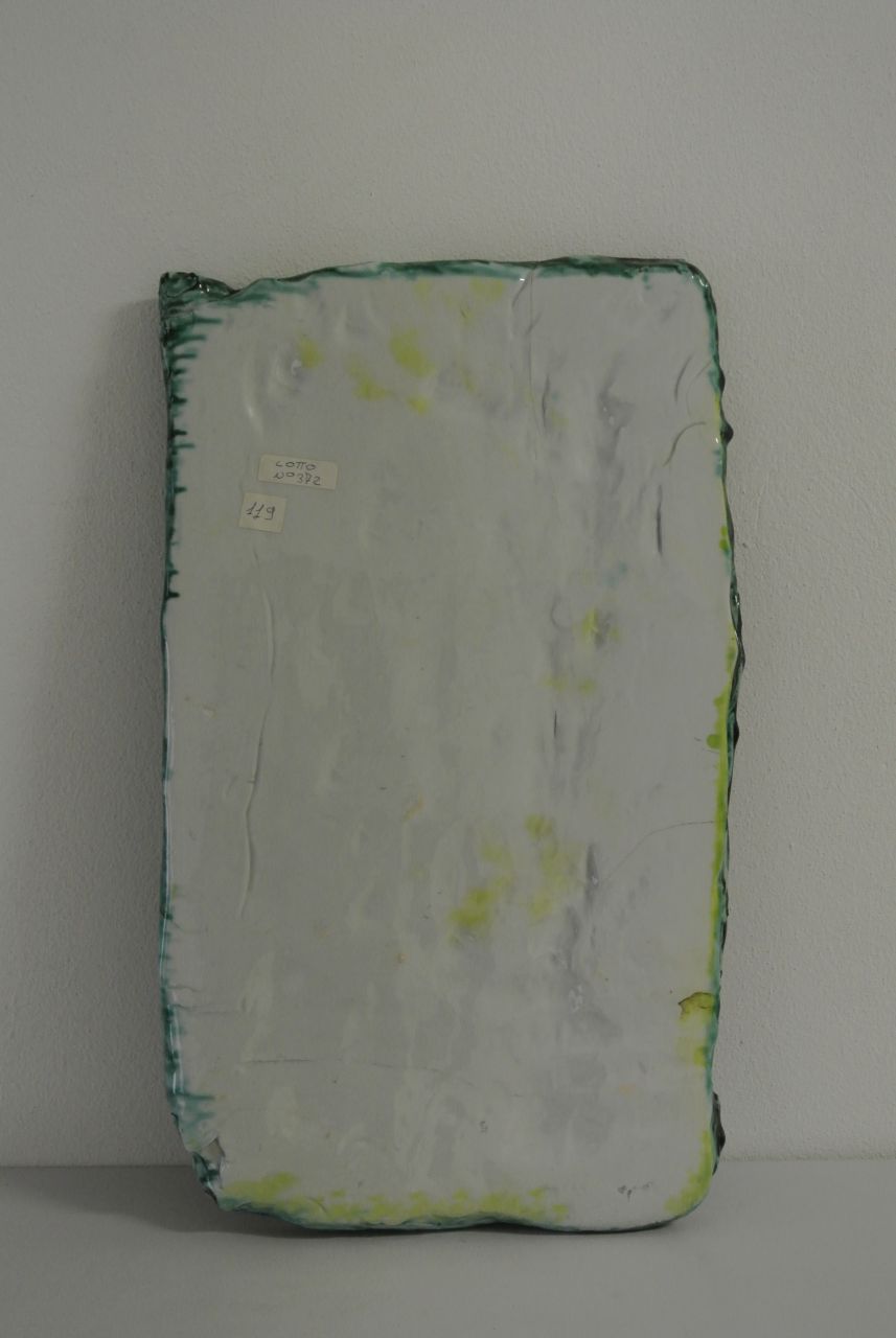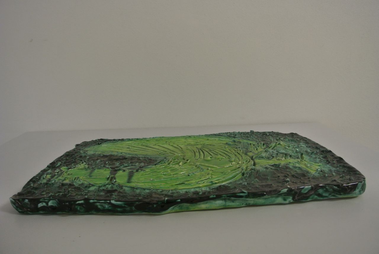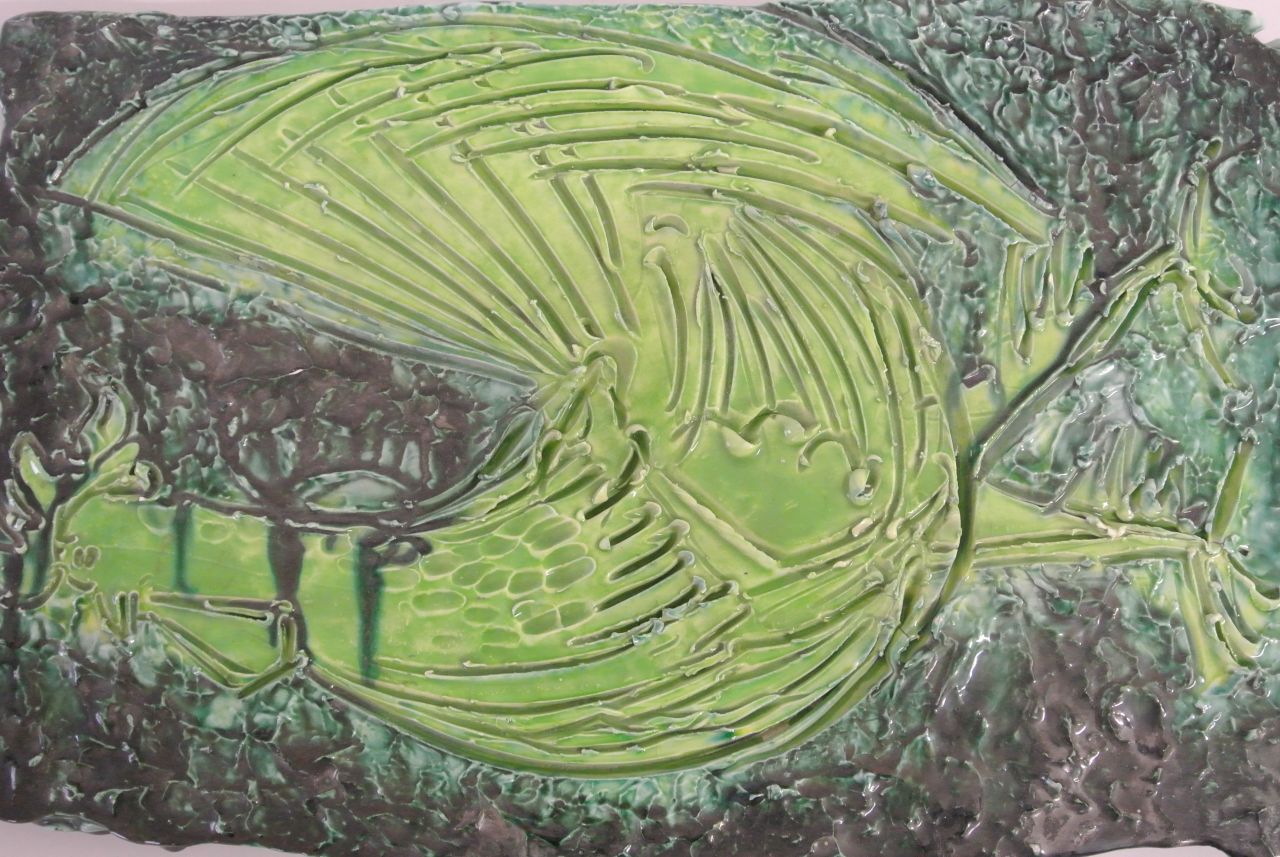 Piastra in ceramica con raffigurazione di gallo stilizzato. Gallo inciso a stecco su impasto tenero e colorato con verde ramina e verde chiaro. Forma rettangolare