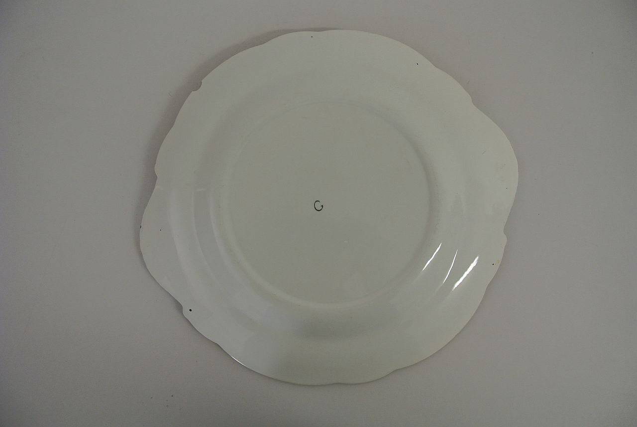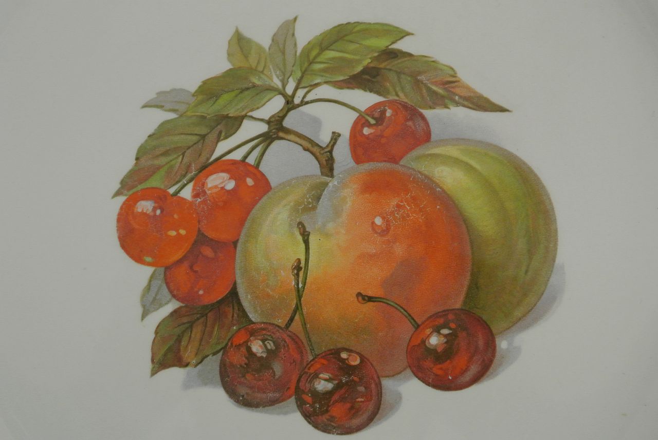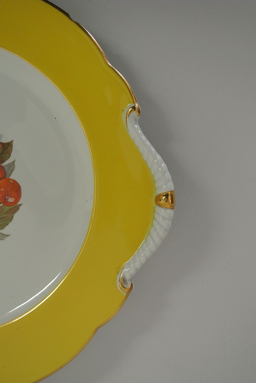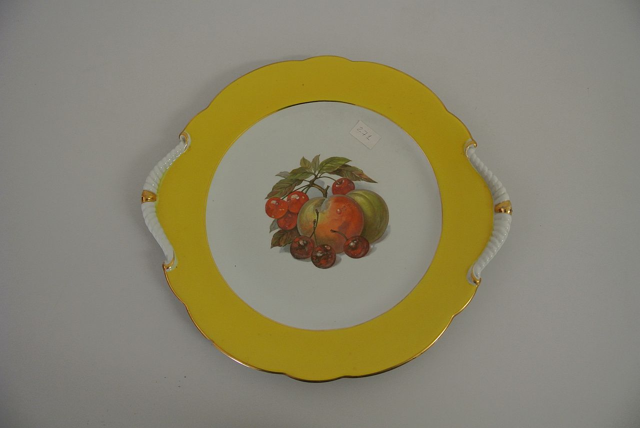 Vassoio in ceramica, bordo lobato, con manici a cordicella, la tesa è di color giallo con filettature in oro all'orlo e al cavetto. Al centro decalcomanie con pesche e ciliegie