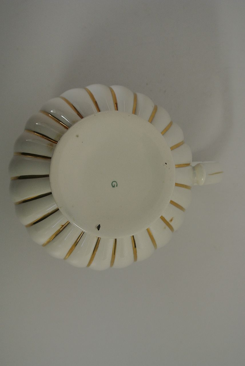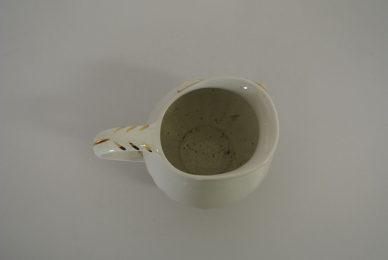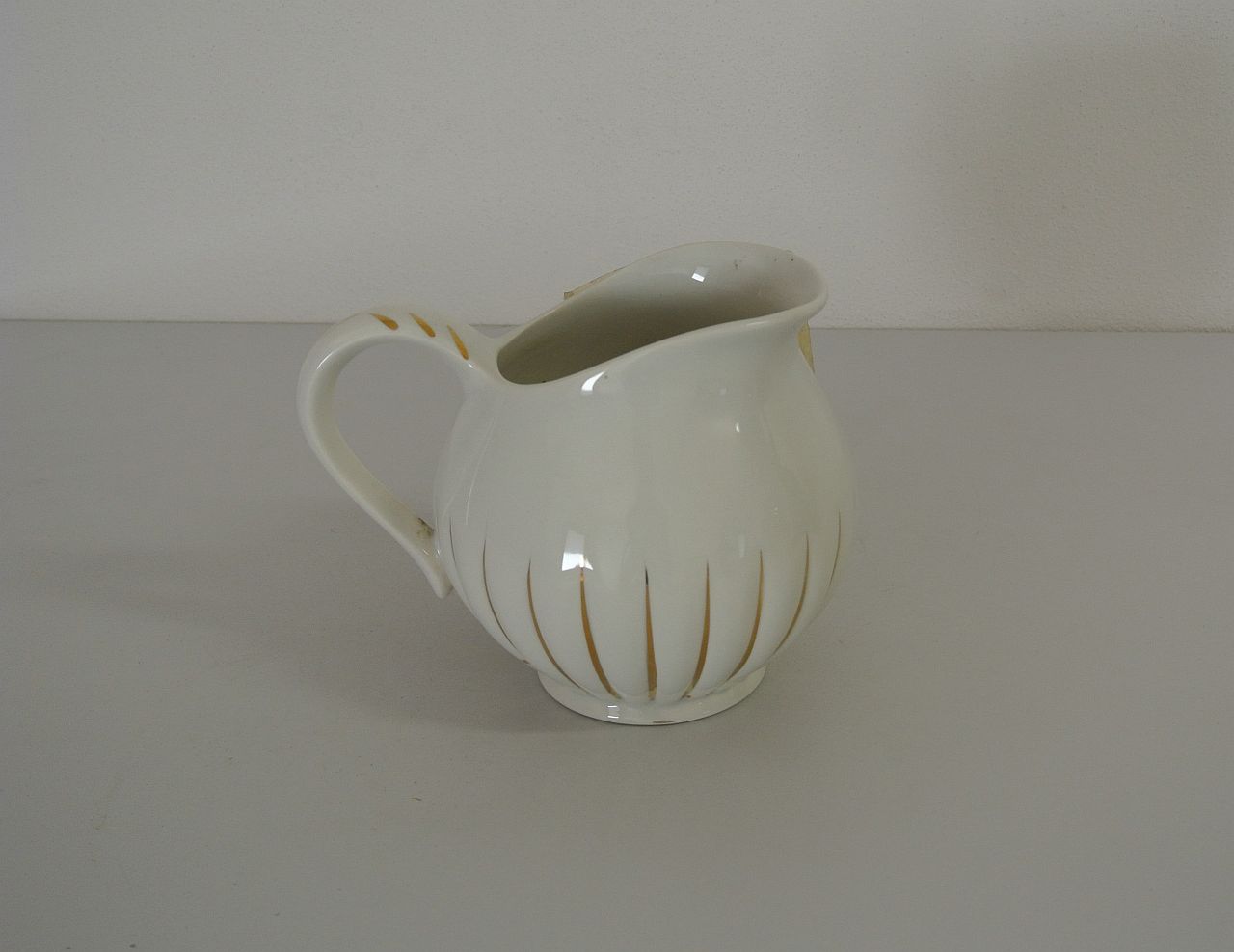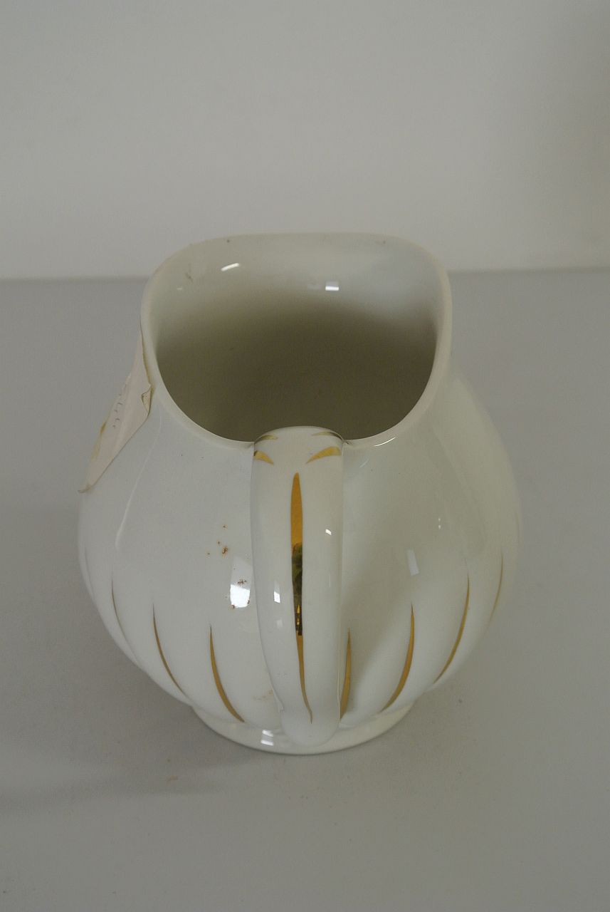 Lattiera in ceramica, fondo bianco, corpo bombato e costolato per metà, filetti in oro marcasolco, beccuccio poco pronunciato, manico a voluta