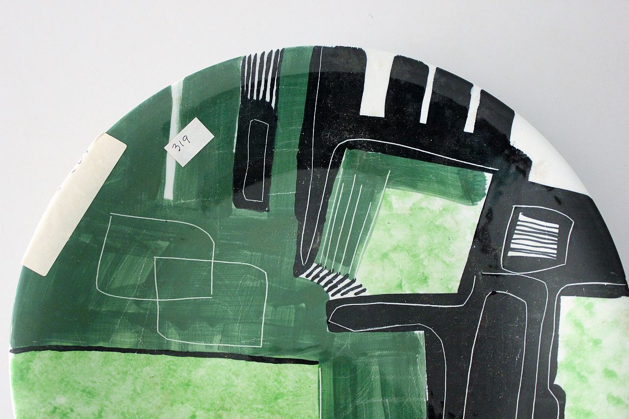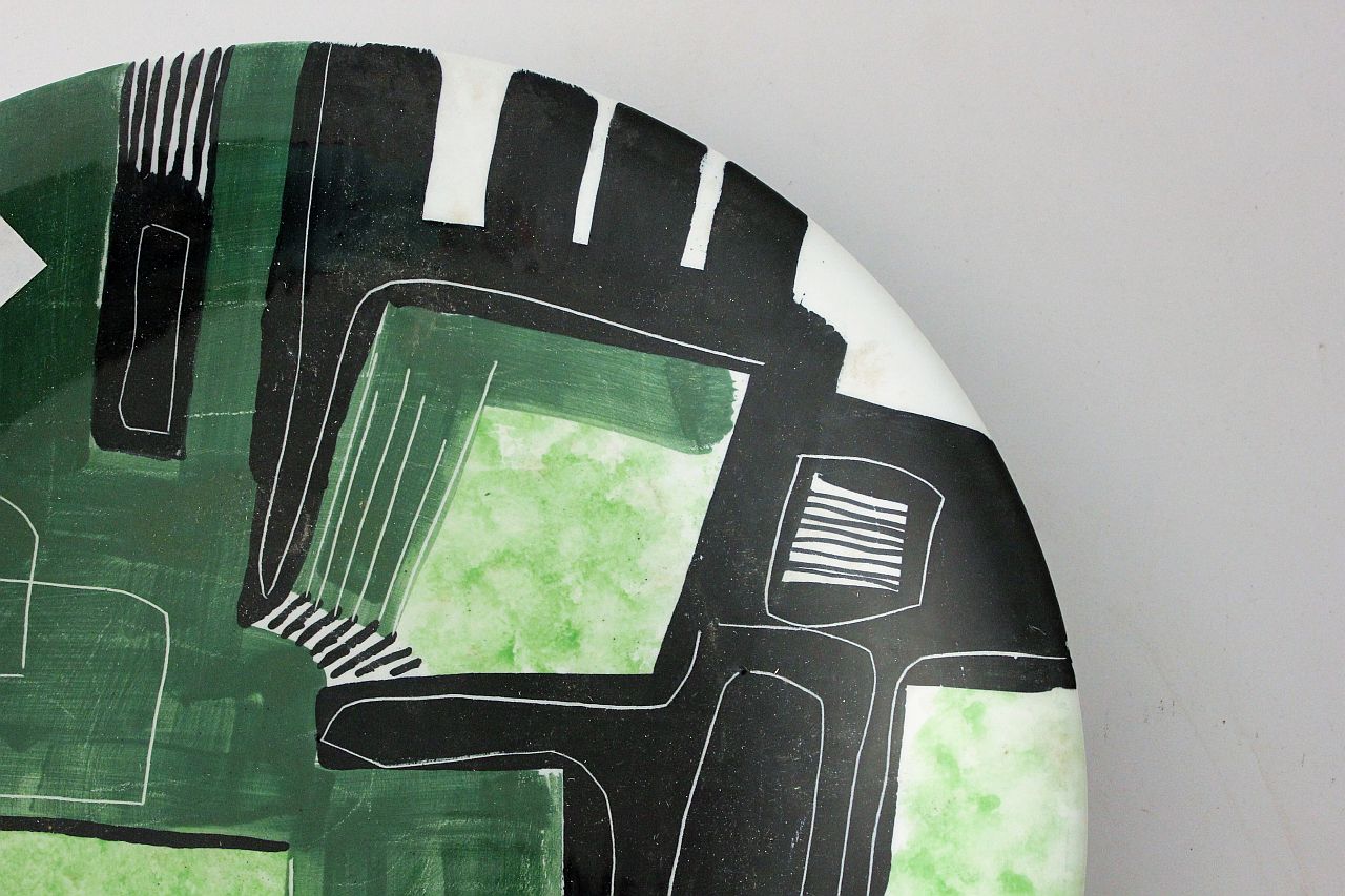 Piatto in ceramica con motivi geometrici irregolari, colori nero, verde e verde chiaro