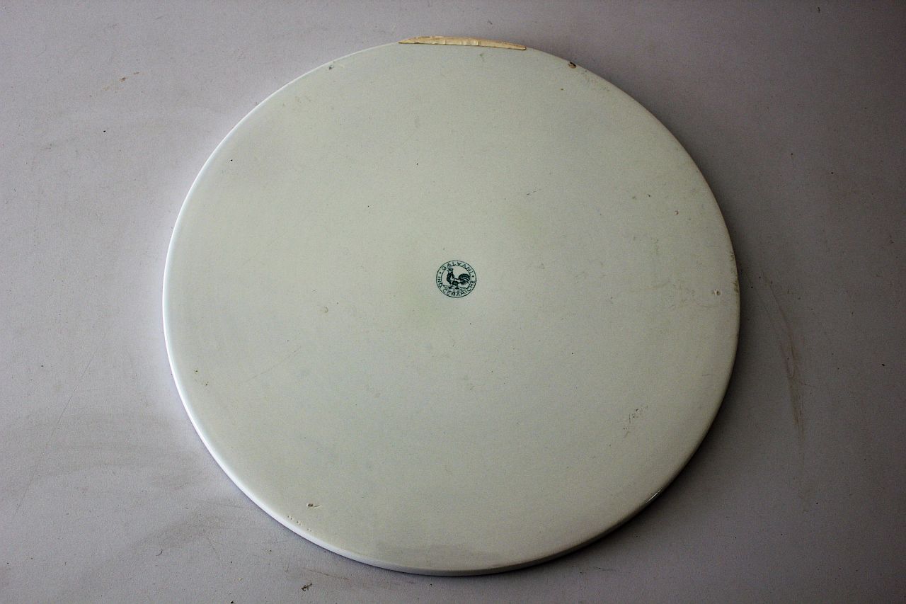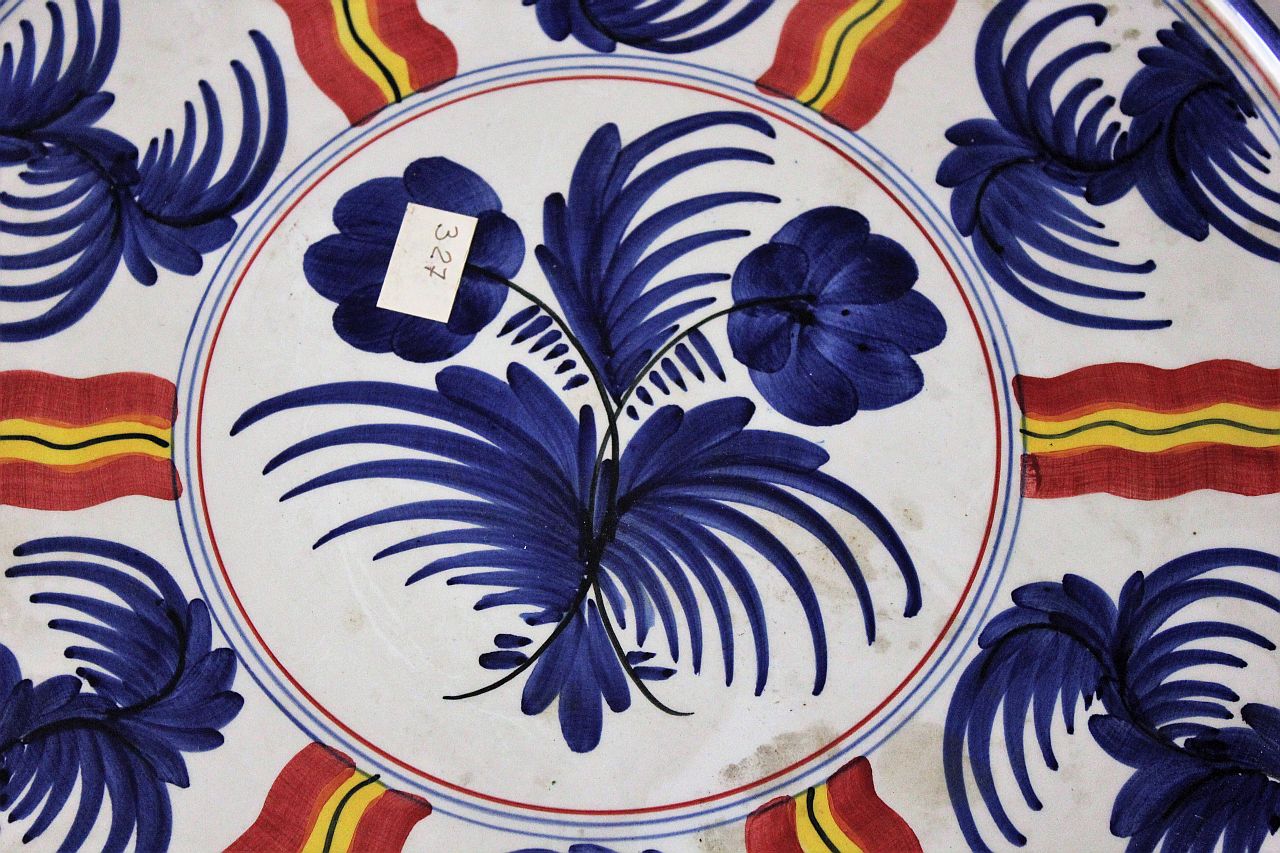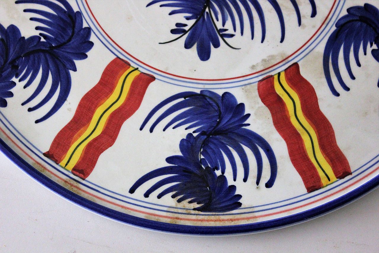 Vassoio a disco, leggero bordino rialzato e filettato blu; il corpo centrale è diviso in settori a strisce ondulate gialle e rosse con filetti in nero, presenta una riserva centrale rotonda e filettata in blu e rosso con fiori blu