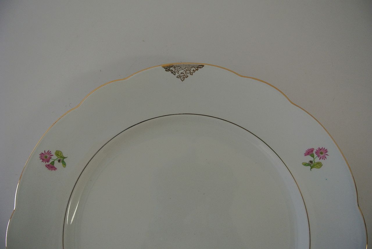 Piatto in ceramica con bordo lobato, tre fiori, filetti e timbri in oro