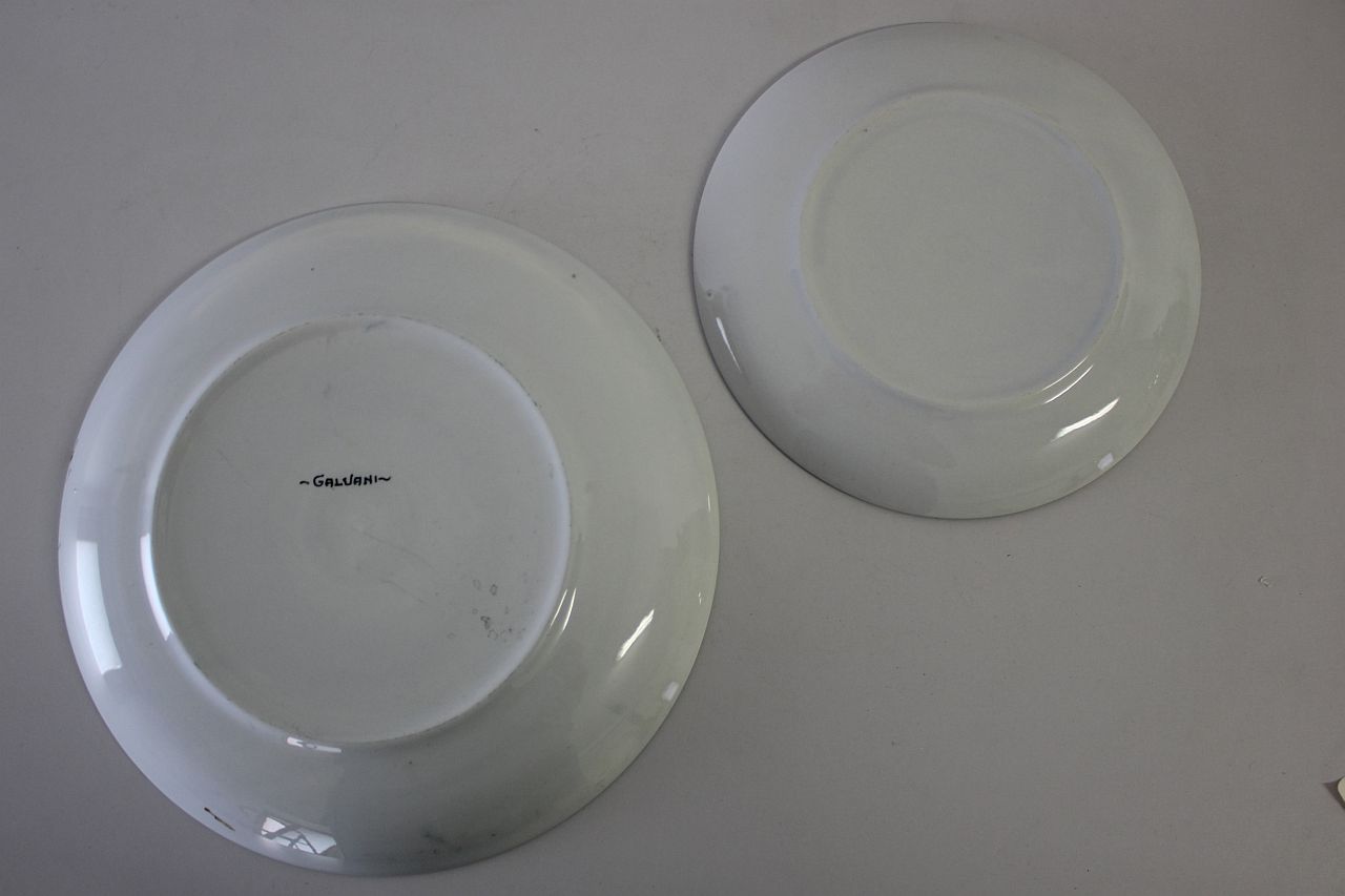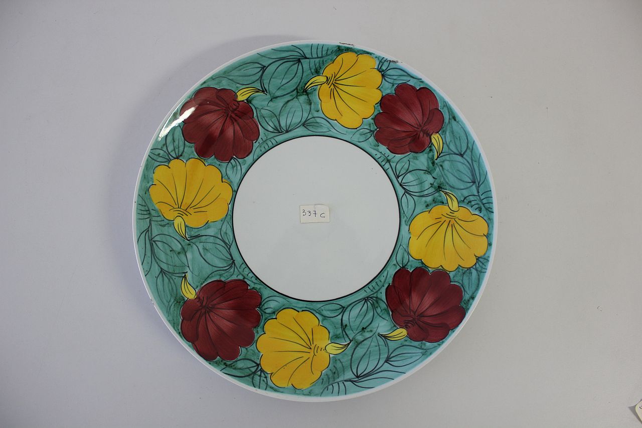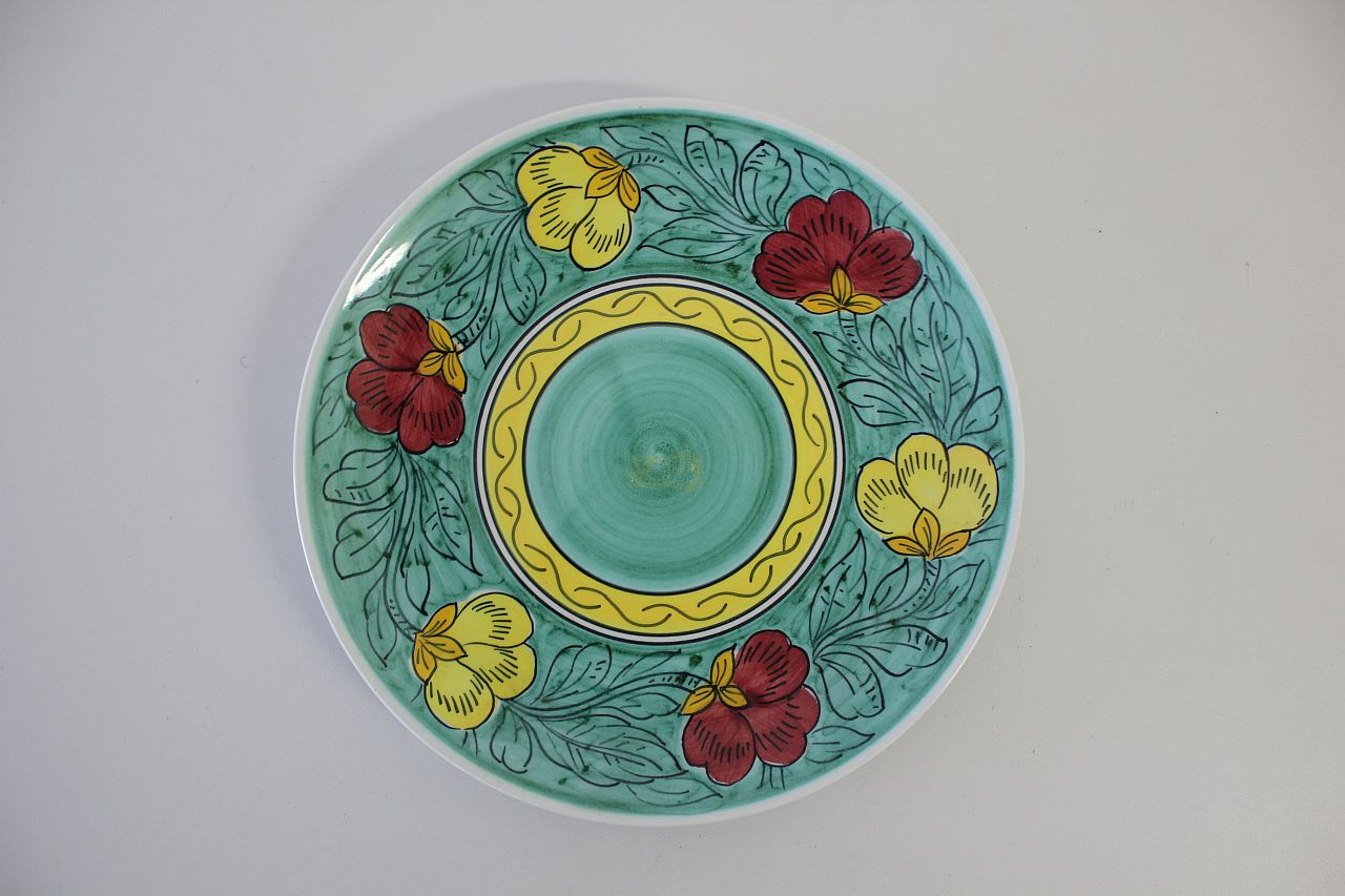 Piatti in ceramica "C - D": "C" con fascia color verde ramina con fiori gialli e rossi a foglie e cavetto bianco; "D" come sopra e con fascia gialla che limita il cavetto colorato in verde