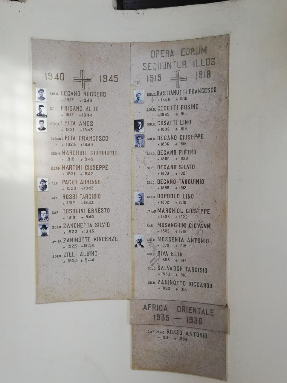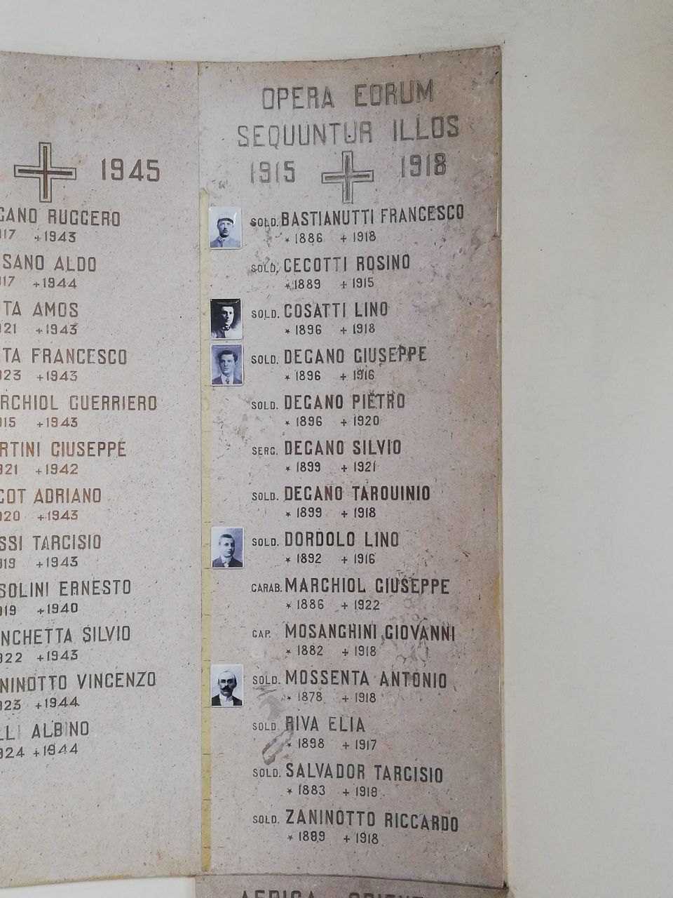 - ISCRIZIONI al centro - OPERA EORUM/ SEQUUNTUR ILLOS/ 1915 1918/ SOLD. BASTIANUTTI FRANCESCO/ * 1886 + 1918/ SOLD. CECOTTI ROSINO/ * 1889 + 1915/ SOLD. COSATTI LINO/ * 1896 + 1918/ SOLD. DEGANO GIUSEPPE/ * 1896 + 1916/ SOLD. DEGANO PIETRO/ * 1896 + 1920/ SERG. DEGANO SILVIO/ * 1899 + 1921/ SOLD. DEGANO TARQUINIO/ *1899 + 1918/ SOLD. DORDOLO LINO/ * 1892 + 1916/ CARAB. MARCHIOL GIUSEPPE/ * 1882 + 1918/ SOLD MOSSENTA ANTONIO / * 1878 + 1918/ SOLD. RIVA ELIA/ * 1898 + 1917/ SOLD. SALVADOR TARCISIO/ * 1883 + 1919/ SOLD. ZANINOTTO RICCARDO/ * 1889 + 1918 - maiuscolo -