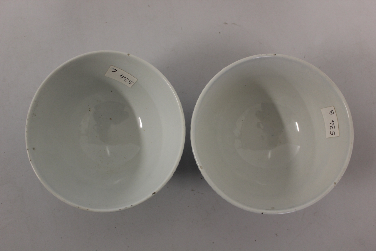 Coppia di scodelle in ceramica dal corpo ovale, piede espanso. Fondo bianco con fascia esterna dipinta rispettivamente nei colori rosa e azzurro, decoro a rilievo con motivi vegetali e animali (erba, fiori e farfalle)