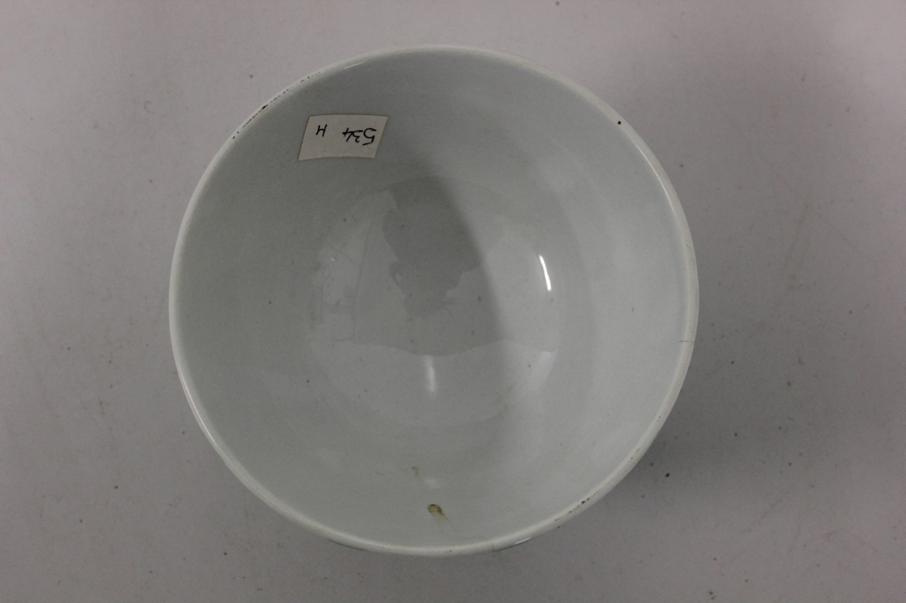 Scodella in ceramica modellata e dipinta, corpo ovale, piede espanso. Fondo bianco inciso a rette con righe verticali convergenti a formare quadratini a scalare dipinti di colore verde