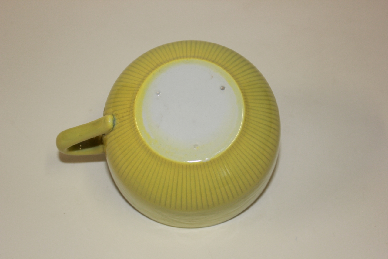 Tazza in ceramica modellata e dipinta, corpo tronco conico a rientrare verso la base, manico ad archetto. Esterno modellato nella parte inferiore con motivo millerighe a rilievo, nella parte superiore con foglie impresse. Fondo bianco, esterno dipinto in monocromo giallo
