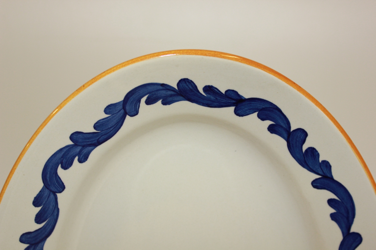 Piatto da portata in ceramica modellata e dipinta. Forma ovale, fondo bianco, filetto ocra sul bordo. Ala decorata a mano con festone stilizzato in colore blu
