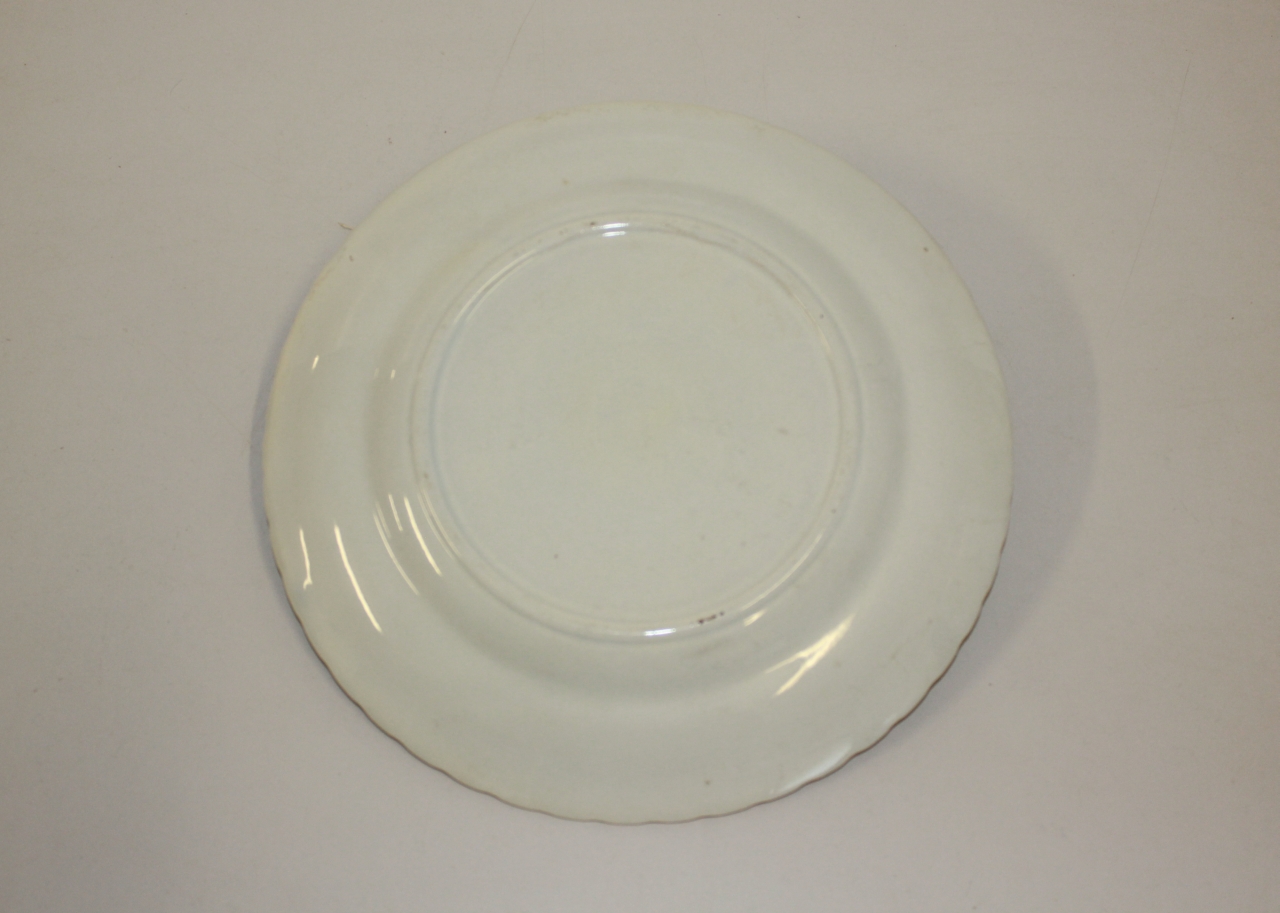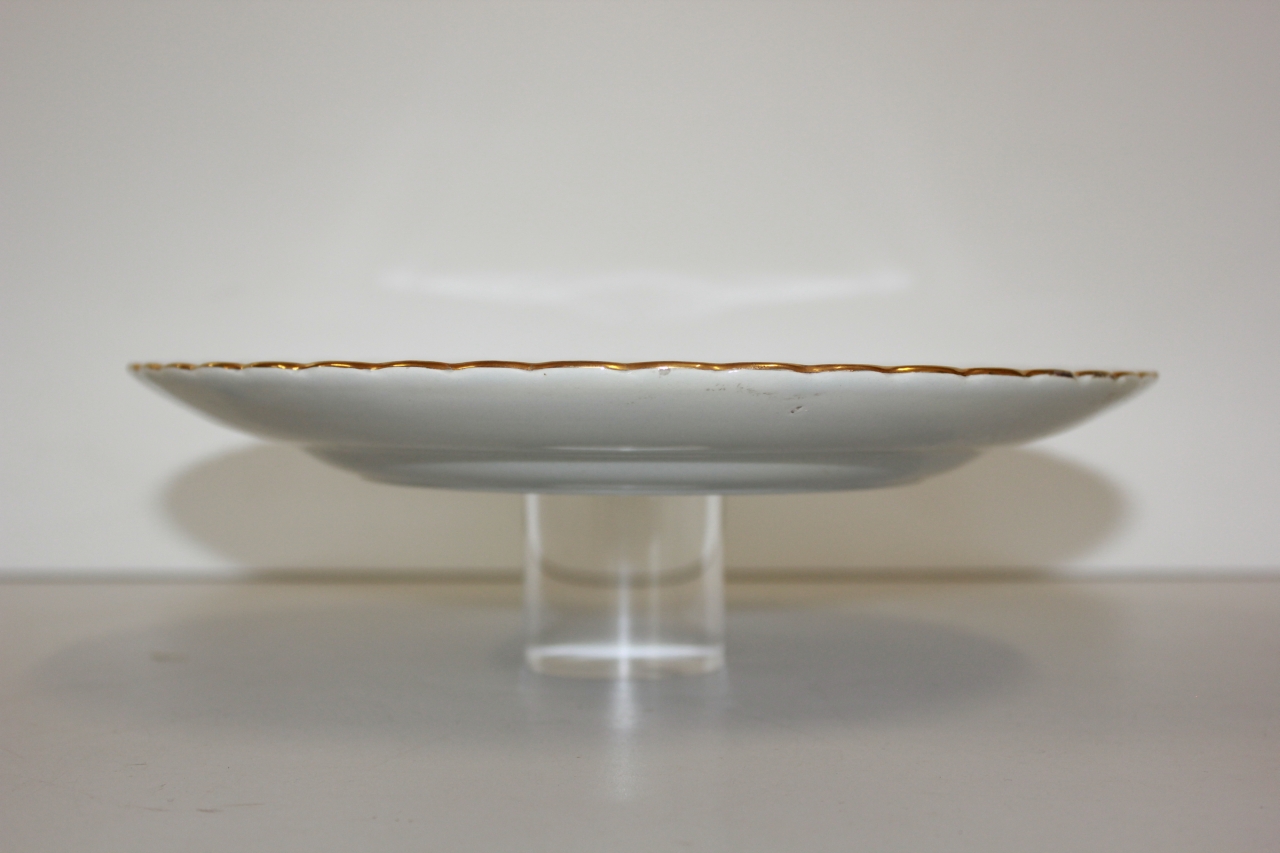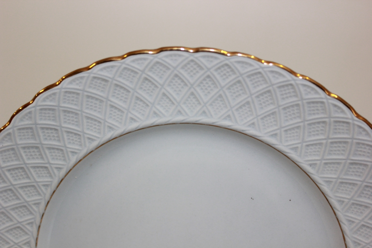 Piatto piano in ceramica modellata e dorata. Bordo lobato, ala modellata in rilievo con motivi stilizzati ad intreccio. Fondo bianco, filetti dorati a delimitare l'ala