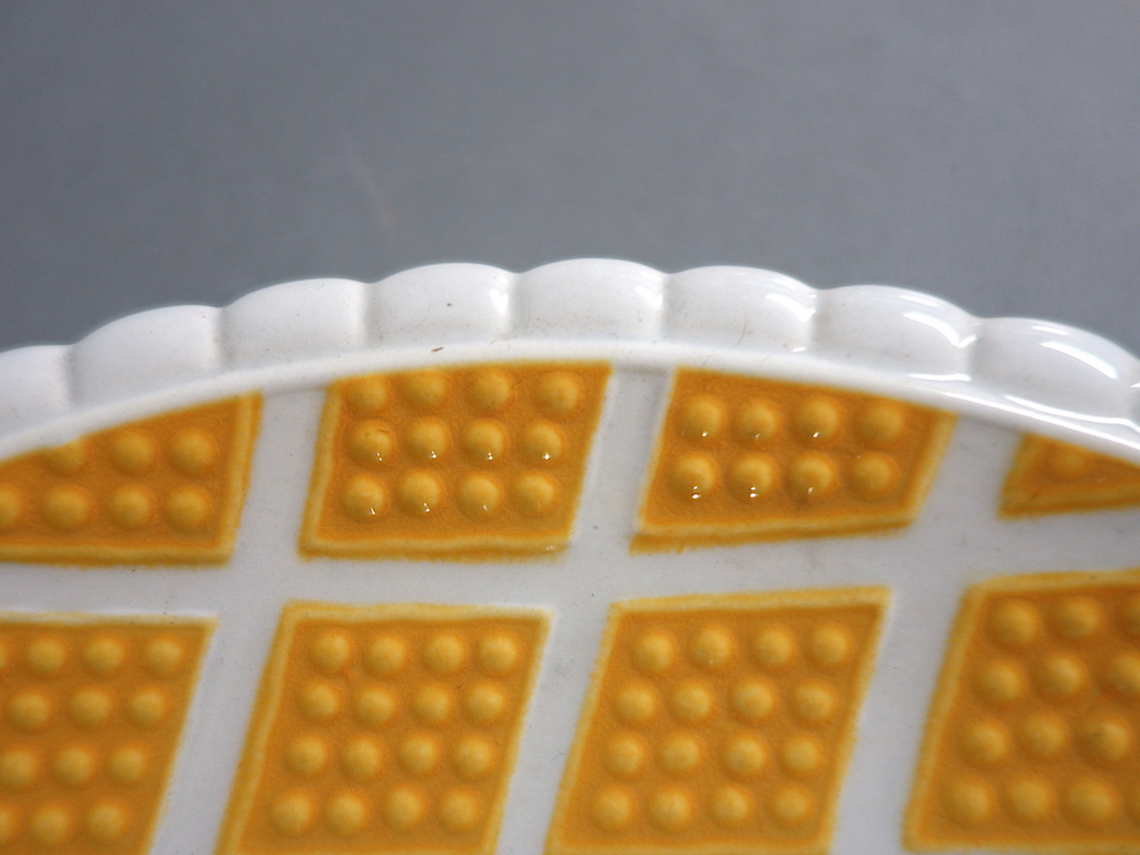 Piatto da portata in ceramica decorata e modellata. Orlo a cordoncino. Intera superficie decorata a rilievo a losanghe perlinate color giallo ocra