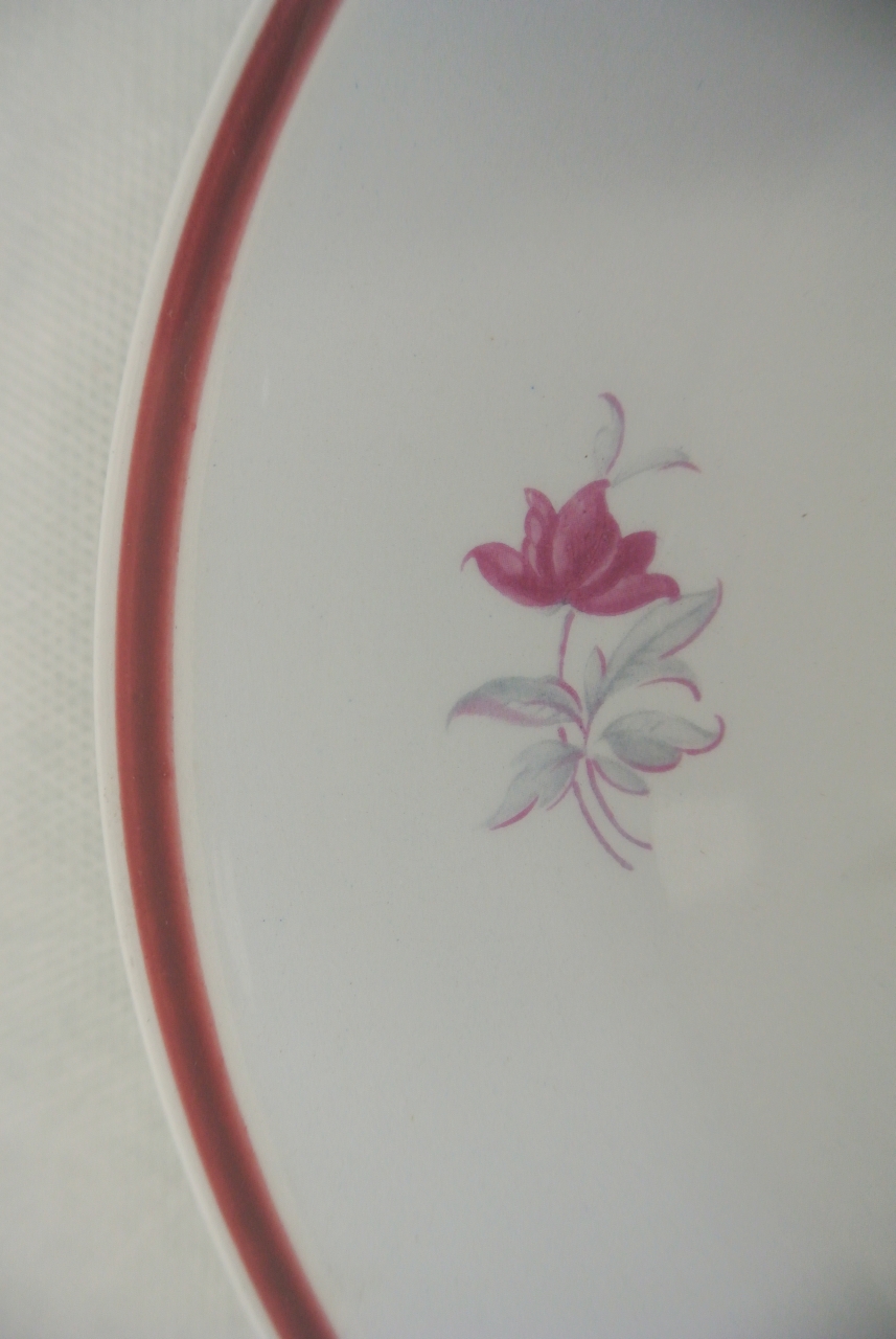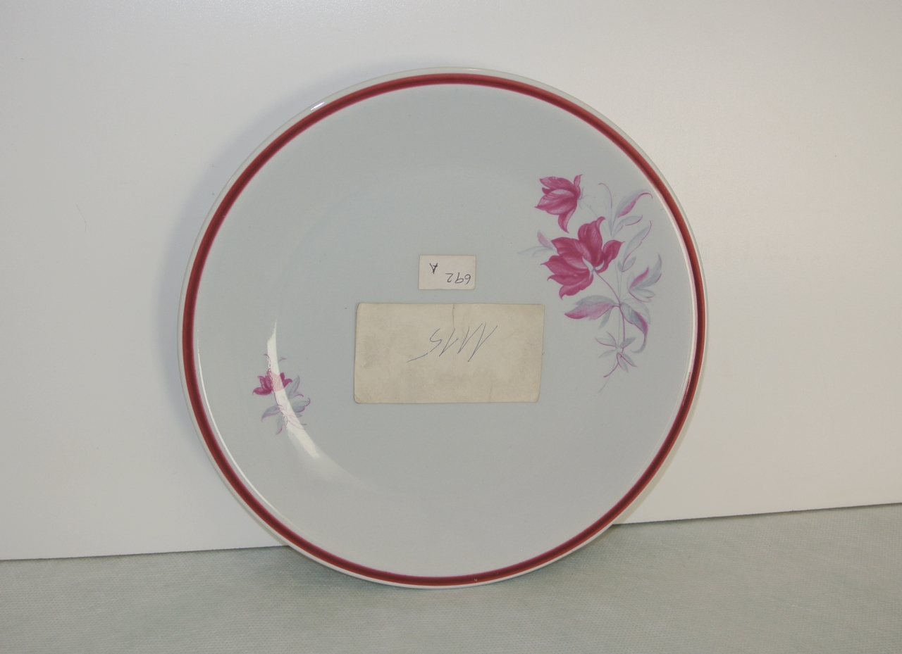 Piatto piano in ceramica modellata e decorata. Fondo bianco, ala filettata in color marrone, cavetto decorato con decalcomanie a tralci fogliati e fioriti
