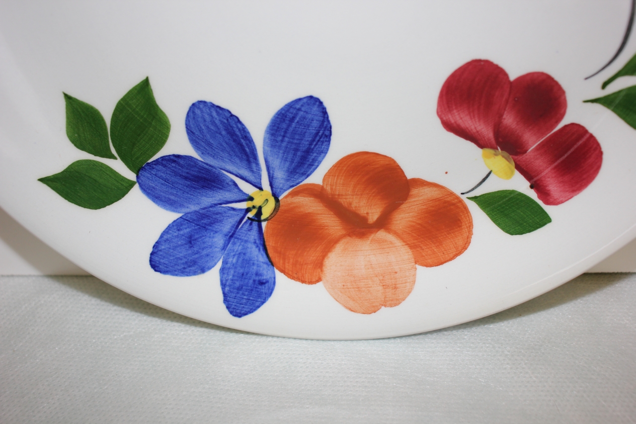Piatto piano in ceramica modellata e dipinta. Forma tronco conica, fondo bianco, decorazione eseguita a mano a grandi tralci con fiori policromi e foglioline verdi