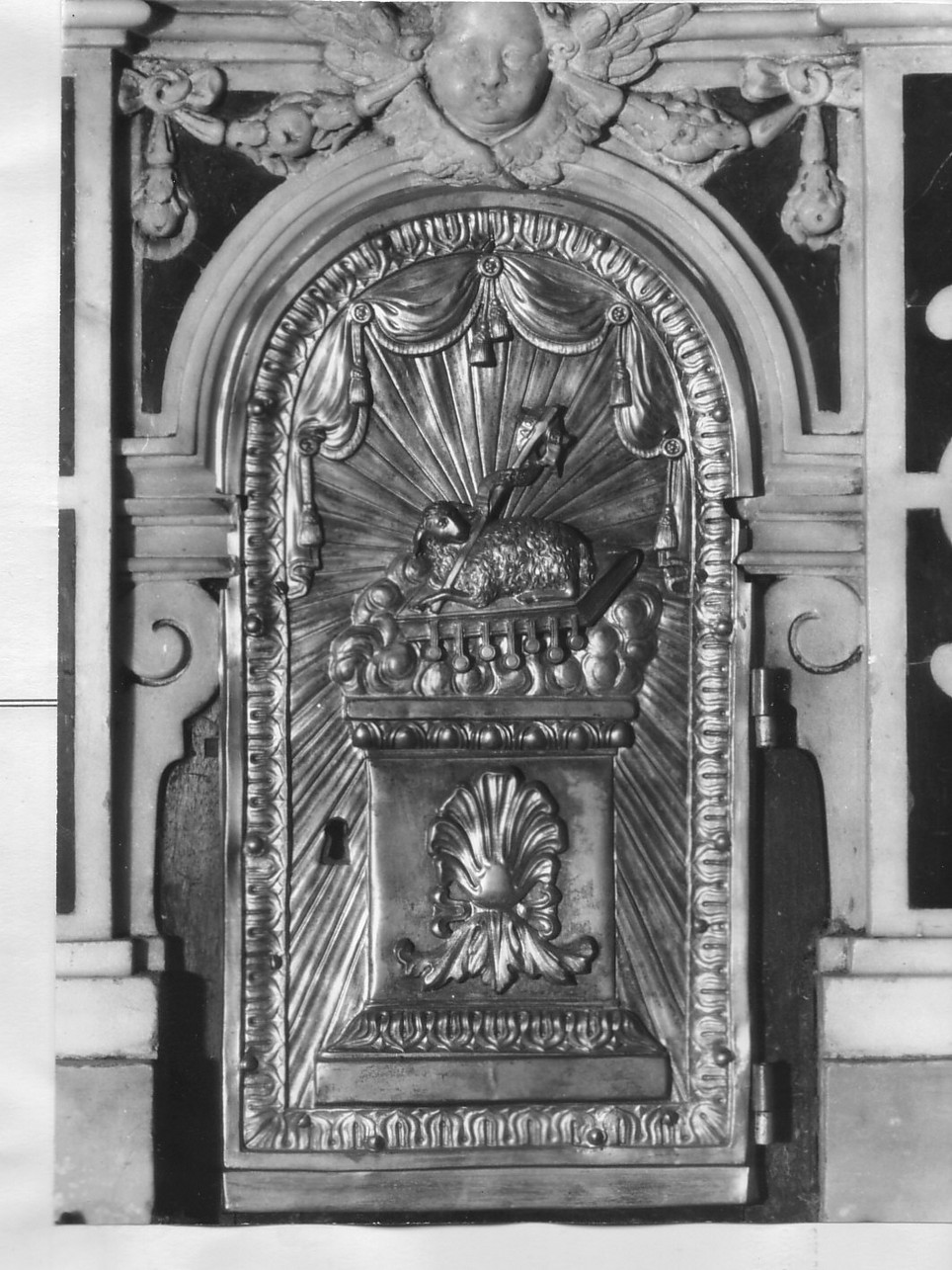 Sull'ara sacrificale, l'agnello divino poggia sul messale, che è a sua volta sostenuto da nubi. Dietro una raggiera di luce; la scena è superiormente incorniciata da un tendaggio