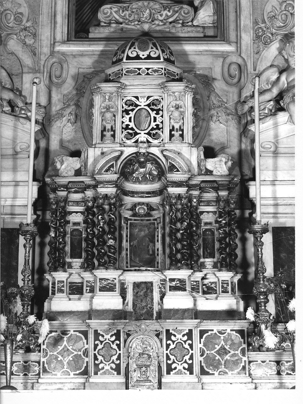 A forma di chiesa a tre navate, con un ordine di colonne tortili marmoree su alta base, delle quali la coppia central, più avanzata, sorregge il timpano curvo spezzato, con una nicchia decorata, nel catino da un Dio Padre benedicente soprastante un piccolo sportello dipinto. La parte superiore è costituita da una cupola ottogonale a marmi intarsiati su un tamburo quadrato, con ai lati due angeli a bassorilievo