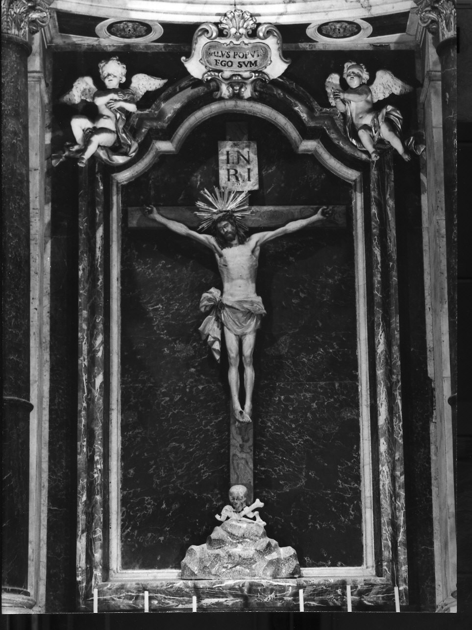 Alla base della Croce sta un teschio con ossa incrociate, motivo da collegare con la destinazione della cappella al culto dei defunti. Al di sopra della testa del cristo, la scritta INRI