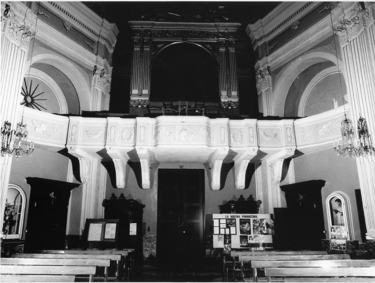 Su mensole sagomate unite alla controfacciata, orante da baccellature, foglie di acanto e sinuosi motivi fitomorfi, concluse anteriormente da teste di cherubino, si alza il parapetto a profili mistilinei modanati, suddiviso in metope che recano, rilevate sulle sporgenze, composizioni di corolle su foglie d'acanto alternate a pendoni e serti di alloro sulle rientranze. Nelle due ampie rientranze ai lati sono raffigurati strumenti musicali con sinuosi rami di alloro, ricorrenti sulla larga sporgenza centrale dove è raffigurato il re David arpista tra due angeli seduti