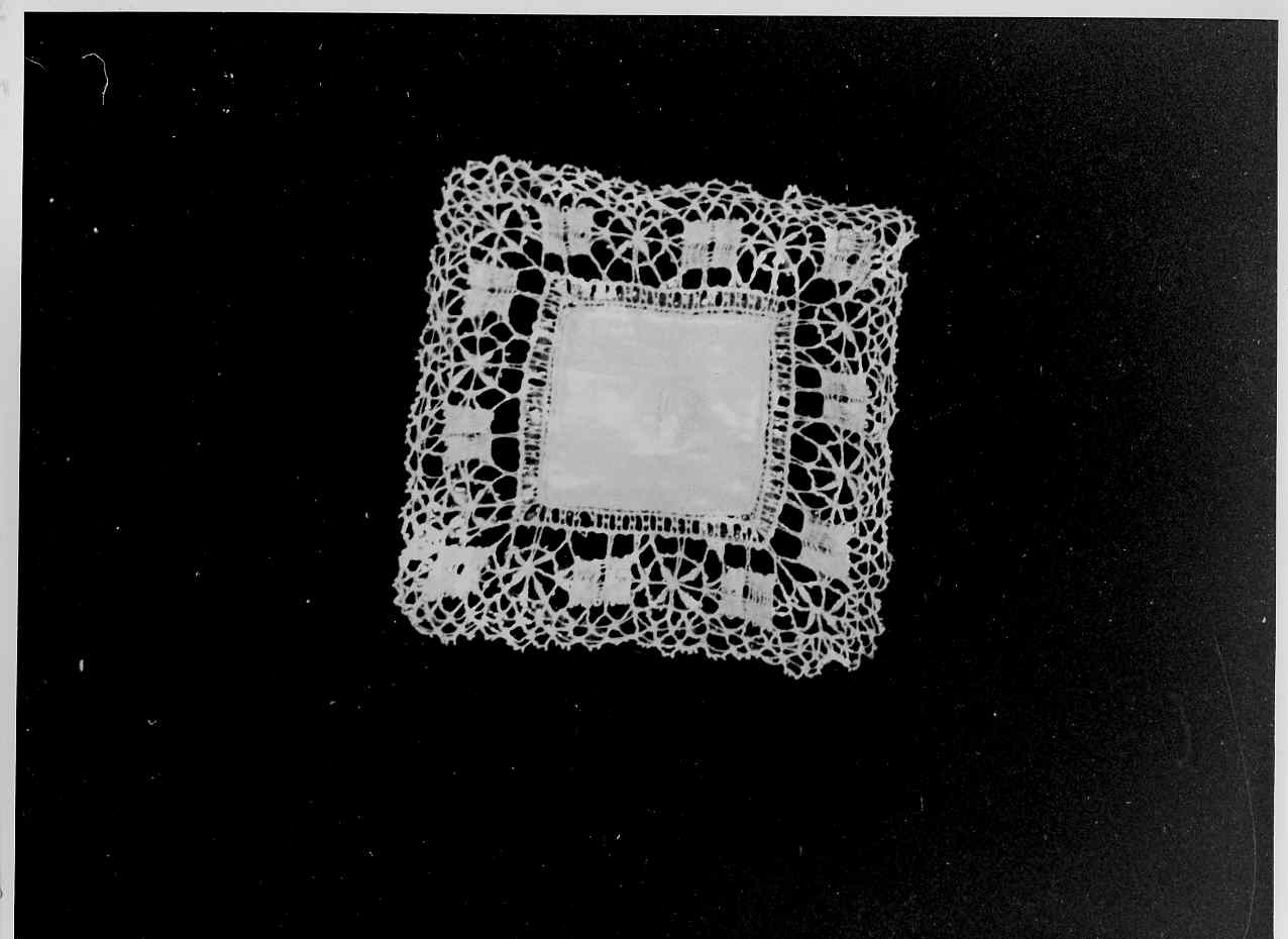 - NOTIZIE STORICO CRITICHE La tecnica del pizzo è tipicamente ligure, a fili continui. Il motivo decorativo delle rosette composte di armelle a punto stupia è anche ligure, richiama in particolare gli elementi caratteristici della produzione genovese del XVII secolo, largamente imitata e rielaborata nel XIX secolo anche in altri paesi europei. In qwuesto pezzo la lavorazione è piuttosto irregolare, il filo relativamente sottile. Il bordo è lavorato su misura per il riquadro di tela e non presenta pieghe agli angoli. La palla è inamidata a lucido. Tela e pizzo sono di colore bianco avorio