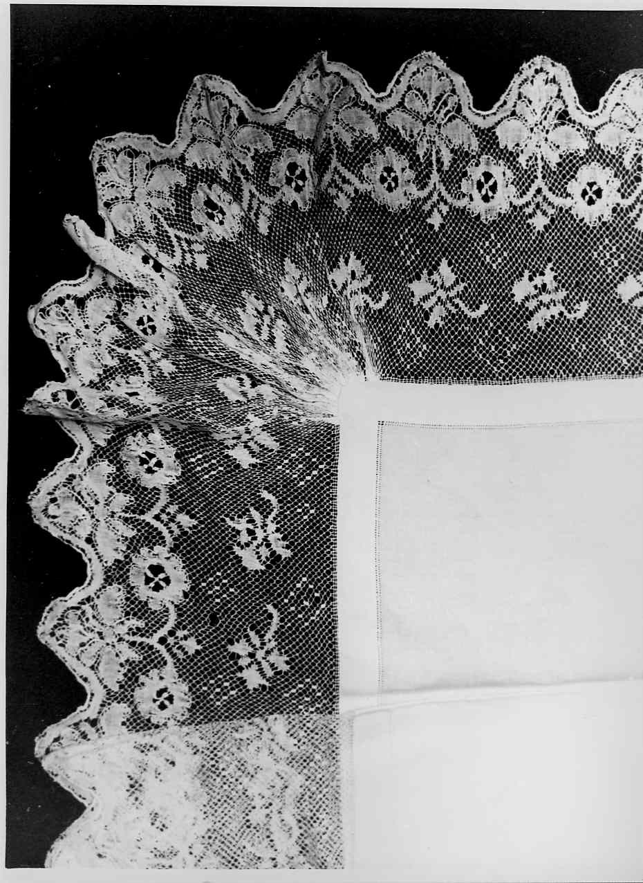 - NOTIZIE STORICO CRITICHE Il disegno e i motivi floreali del pizzo risulta incerto e confuso. I pieni a punto tela poco serrato risaltano poo sulla rete di fondo, nonostante siano incorniciati dal cordonetto. Questo pezzo può essere considerato rappresentativo della prouzione ligure ottocentesca a livello popolare, protattasi senza sostanziali modifiche nel secolo successivo, in scala sempre più ridotta. Originale in questo pezzo la fusione dei motivi floreali con la rete "torchon" a maglie romboidali, abbinata abitualmente a motivi decorativi esclusivamente geometrici. Tipici del pizzo "torchon" anche i rombi formati da "pointe d'esprit" quadrati giustapposti, che qui risultano estranei alla decorazione floreale a cui sono stati avvicinati