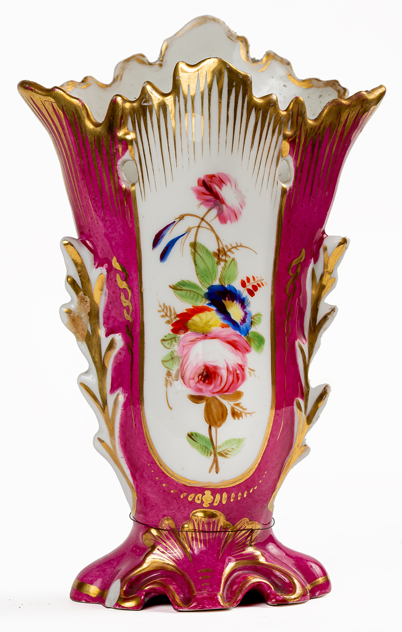 I vasi, su piede lobato, hanno il corpo decorato, nella parte anteriore, da fiori nei toni blu, verde e rosa; negli spazi di risulta rosso carminio, ai fianchi ramoscelli dorati. Lungo il bordo superiore striature dorate