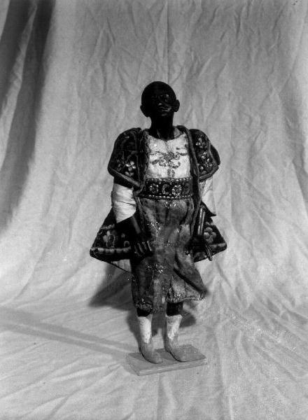 Statua da presepio.LEGNO SCOLPITO/ DIPINTO.VETRO POLICROMO.RASO DI SETA DAMASCATO ROSA/ TAFFETAS DI SETA VERDE/ VELLUTO BLU LISCIO/ BORCHIETTE