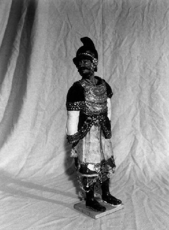 Statua da presepio.LEGNO SCOLPITO/ DIPINTO.VETRO POLICROMO.RASO DI SETA BLU/ TELA DI LINO/ RASO DI SETA VERDE/ RASO DI SETA BIANCO LISERE'/ BORCHIETTE/ FILO D'ARGENTO