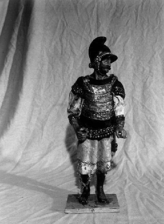 Statua da presepio.LEGNO SCOLPITO/ DIPINTO.VETRO POLICROMO.RASO DI SETA BLU/ RASO DI SETA VERDE/ RASO DI SETA BIANCO LISERE'/ TELA DI LINO.BORCHIETTE.FILO D'ARGENTO