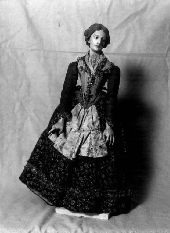 Statua da presepio.LEGNO SCOLPITO/ DIPINTO.VETRO POLICROMO.RASO DI SETA BLU/ BROCCATO/ TAFFETAS DI SETA ROSA LISERE'/ BROCCATO/ RASO DI SETA BIANCO/ ROSA DAMASCATO.GALLONE IN FILO D'ARGENTO LAVORATO A FUSELLI