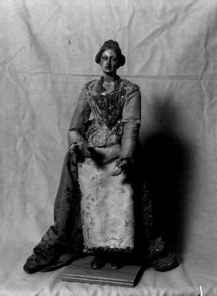 Statua da presepio.LEGNO SCOLPITO/ DIPINTO.VETRO POLICROMO.RASO DI SETA ROSSO/ RASO DI SETA VERDE RICAMATO IN FILO D'ORO/ TAFFETAS DI SETA GIALLO/ TAFFETAS DI SETA ROSA BROCCATO/ PIZZO DI COTONE