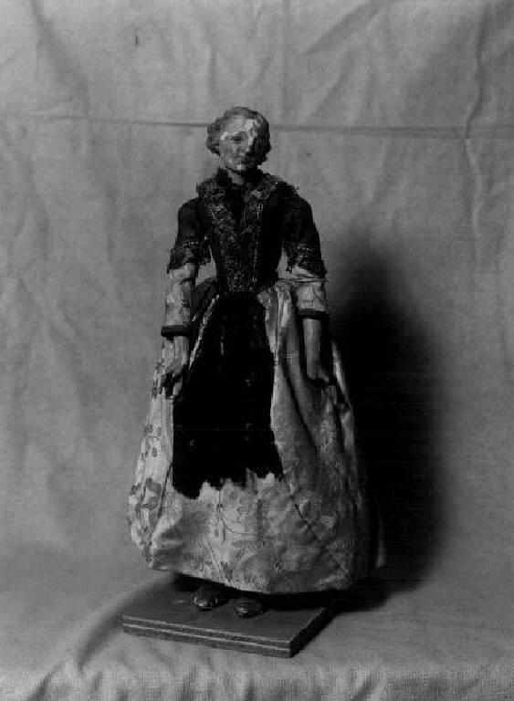 Statua da presepio.LEGNO SCOLPITO/ DIPINTO.VETRO POLICROMO.TAFFETAS DI SETA AMARANTO/ TAFFETAS DI SETA BIANCO/ ROSA/ PIZZO DI COTONE NERO.GALLONE IN FILO D'ORO LAVORATO A FUSELLI